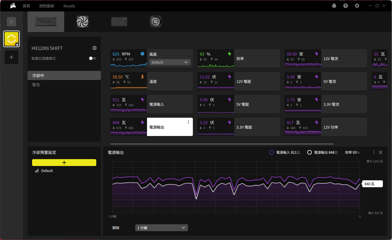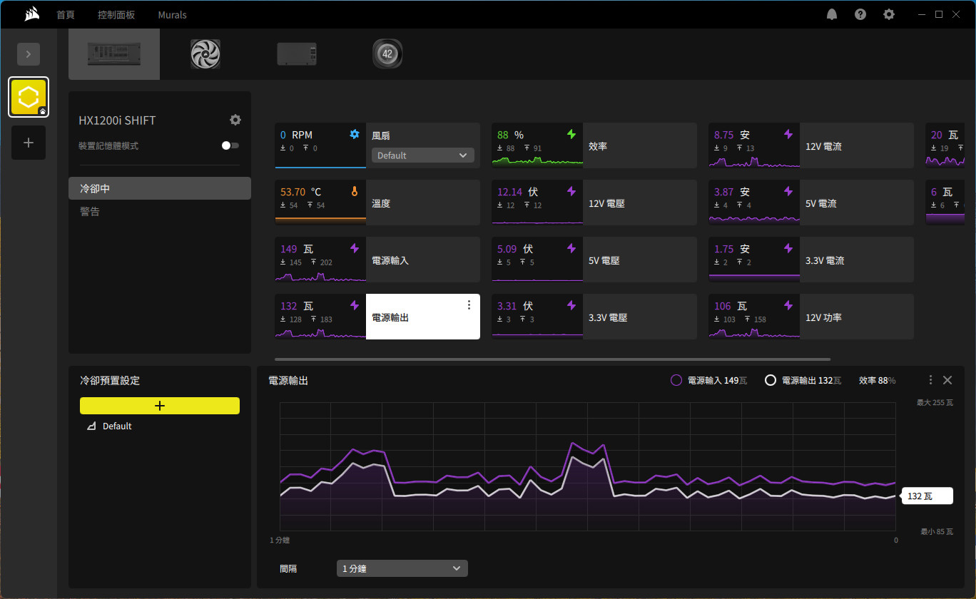 HX1200i SHIFT 裝置頁面會顯示所有電供的資訊,包含風扇轉速、溫度、電源輸入 / 輸出瓦數、電源轉換效率,以及 12V、5V、3.3V 等電壓、電流、功率等即時監控資訊。電供風扇僅只有預設設定檔,玩家不能手動調整電供風扇曲線。