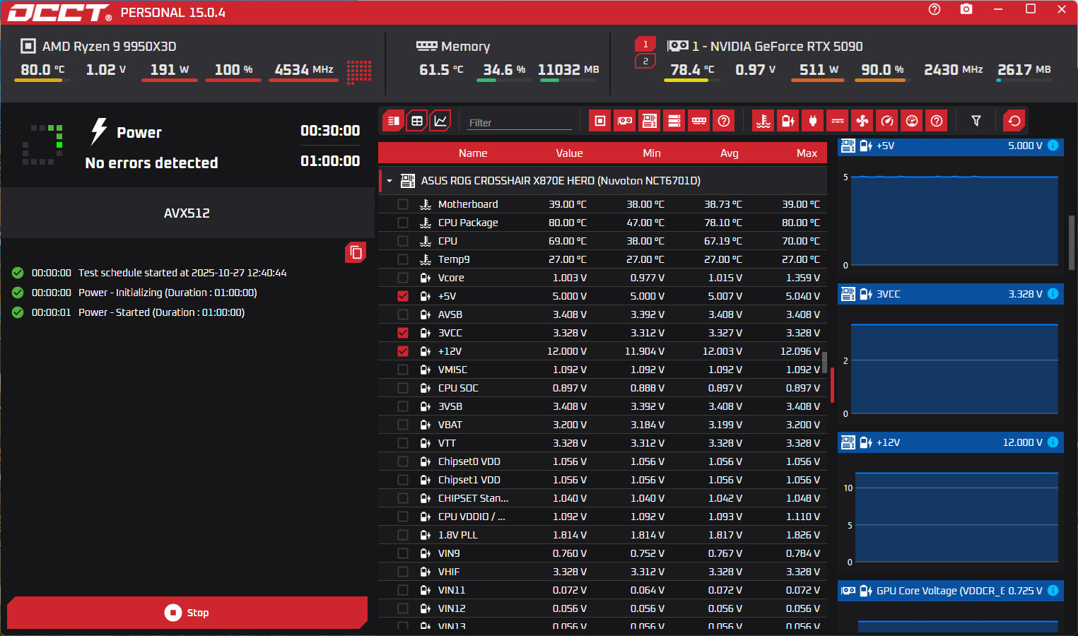測試方面,使用 OCCT 壓力測試軟體,進行 CPU 與 GPU 的雙負載測試,通過軟體檢查主板回報的 +12V、+5V 與 +3.3V 的電壓狀況;使用的硬體為 9950X3D 處理器搭配 ROG CROSSHAIR X870E HERO 主機板、NVIDIA RTX 5090 顯示卡,並安裝於 CORSAIR AIR 5400 機殼當中進行測試。