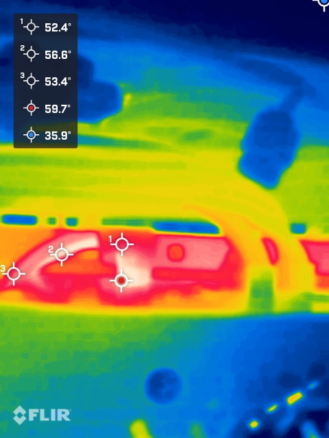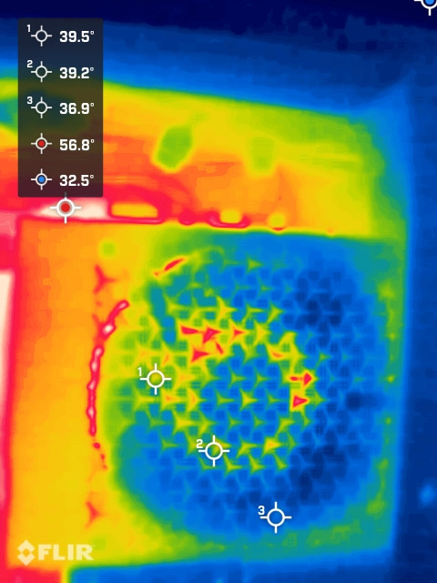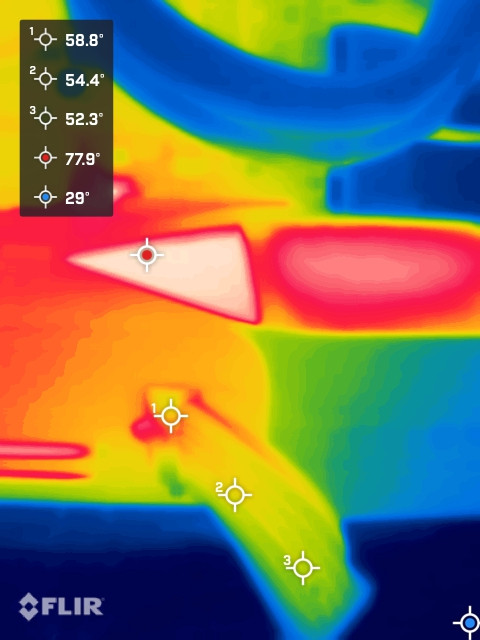 通過熱像儀來觀察 30 分鐘燒機後的顯卡線材端溫度,RTX 5090 供電接頭最高溫來到 58.8°C、線材溫度也在 54°C 左右;至於 HX1200i SHIFT 的模組接頭端,PCIe 12V-2×6 模組線的接頭 59.7°C、線材約在 52-53°C 左右,電源內部熱點則低於這溫度。