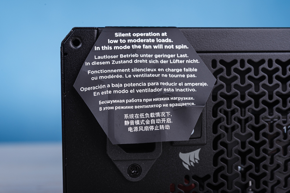 市電輸入端出廠時貼有低負載時會自動停轉風扇的警語,以免沒注意的玩家認為電腦開機、電供風扇沒轉是需要 RMA 的問題。而電源後方僅只有電源開關,並沒有提供風扇停轉的控制開關。