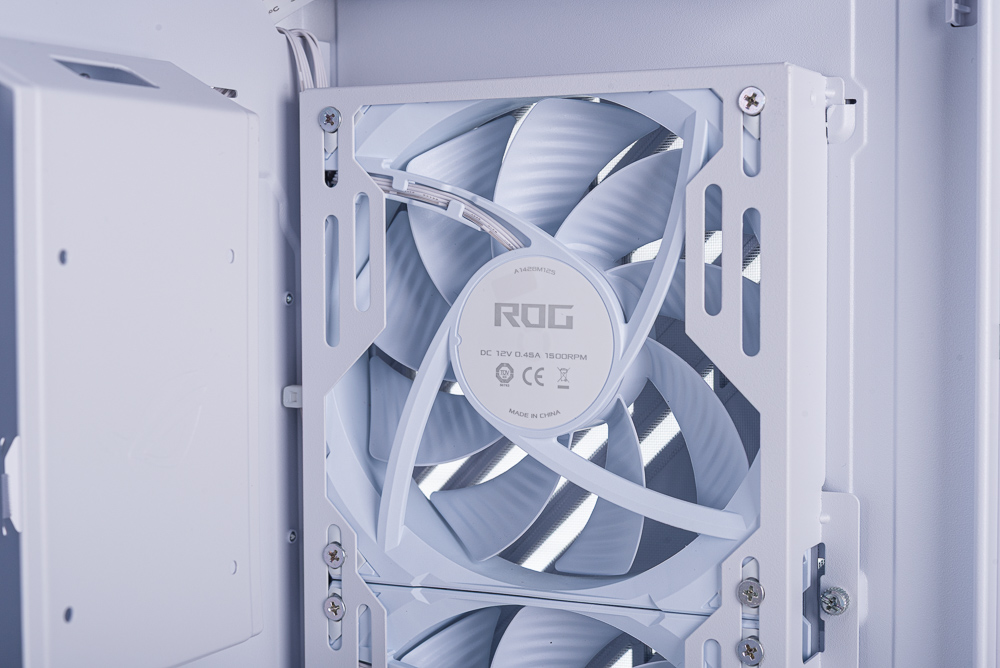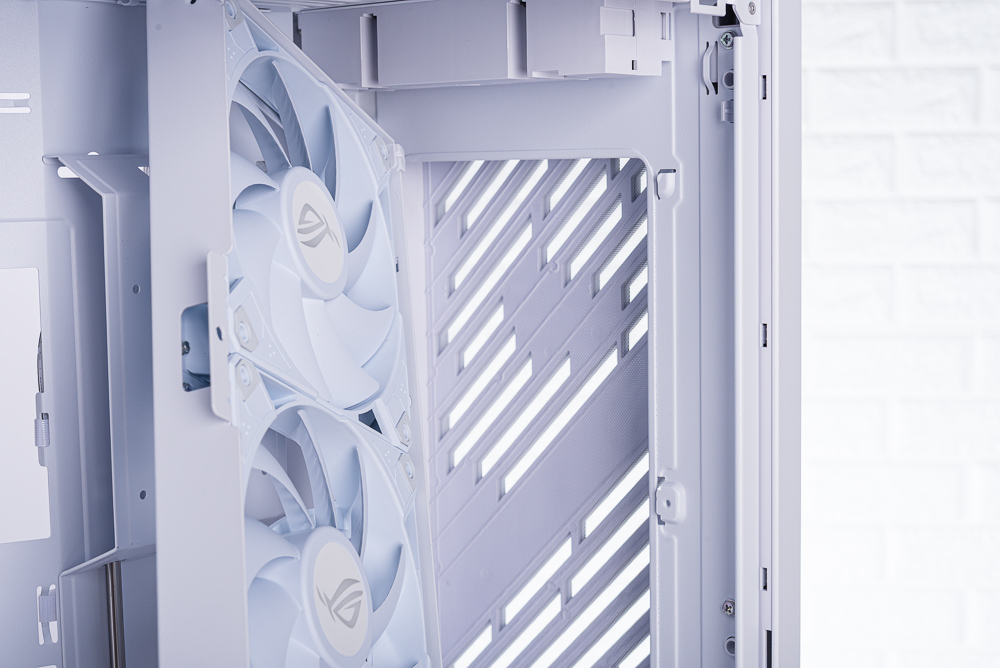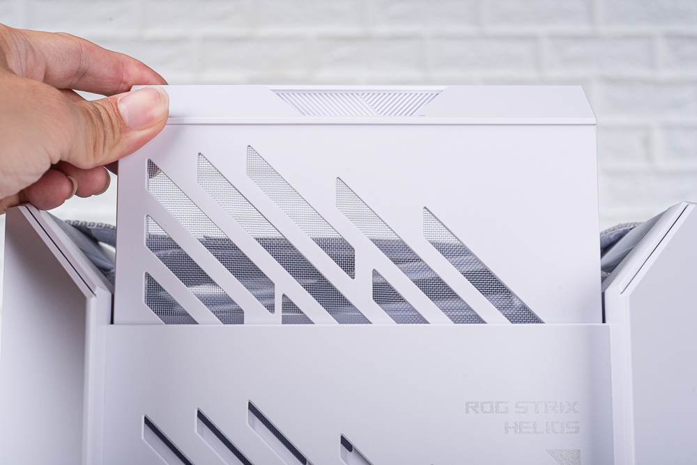ROG Strix Helios II 出廠預裝前 3 後 1 的 140mm、28mm 厚風扇,可確保機殼有著足夠的散熱氣流。不過,機殼前門的外觀件無法直接拆卸,因此若要改裝前風扇的玩家,需取出機殼內部的風扇框架才能改裝。
