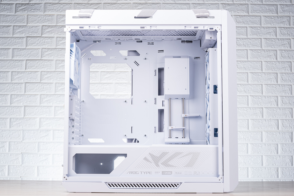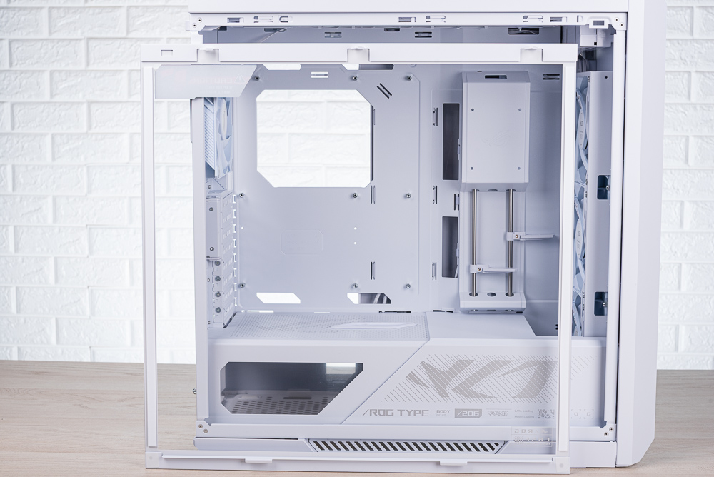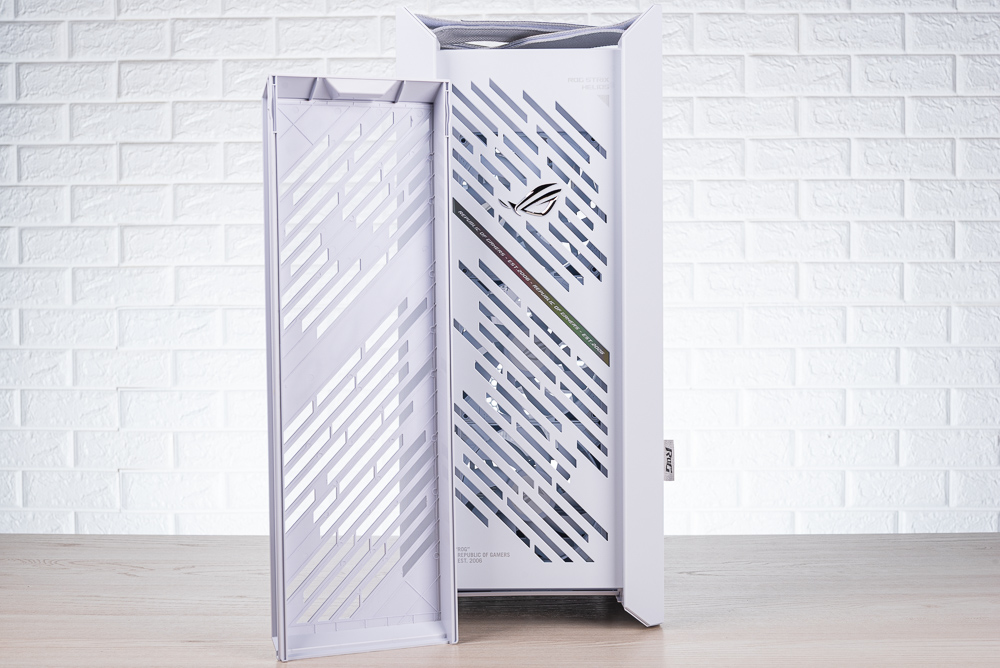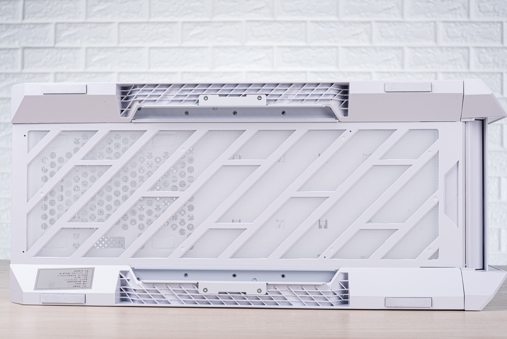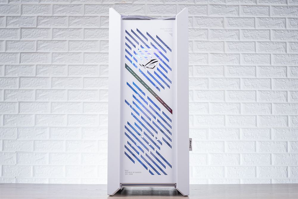 ROG Strix Helios II 有著經典黑色與時下流行的全白款式,白色款的機殼造型上將鋁製外框處理成相同的白色系,而非以往白搭鋁材銀色的風格,因此鋁框質感沒那麼明顯。但霸氣造型下,維持著左右玻璃側透、墊高的底座等造型依舊帥氣。