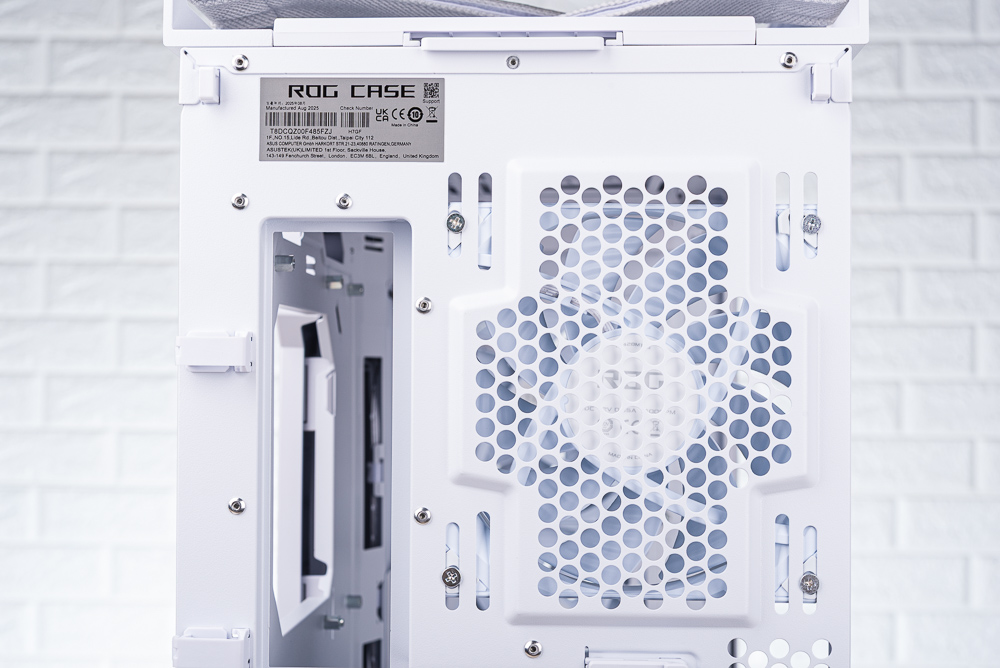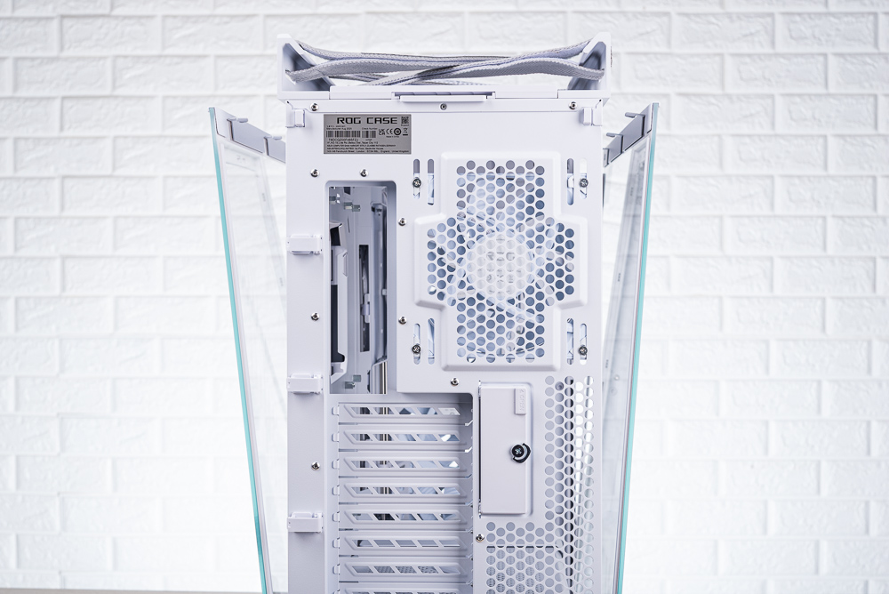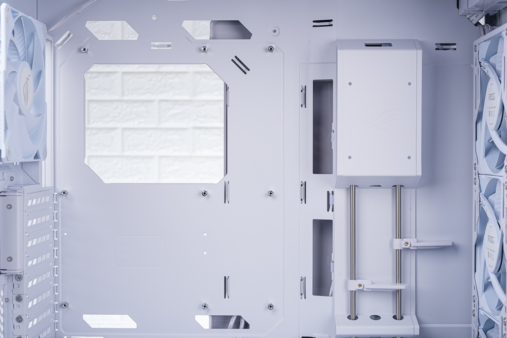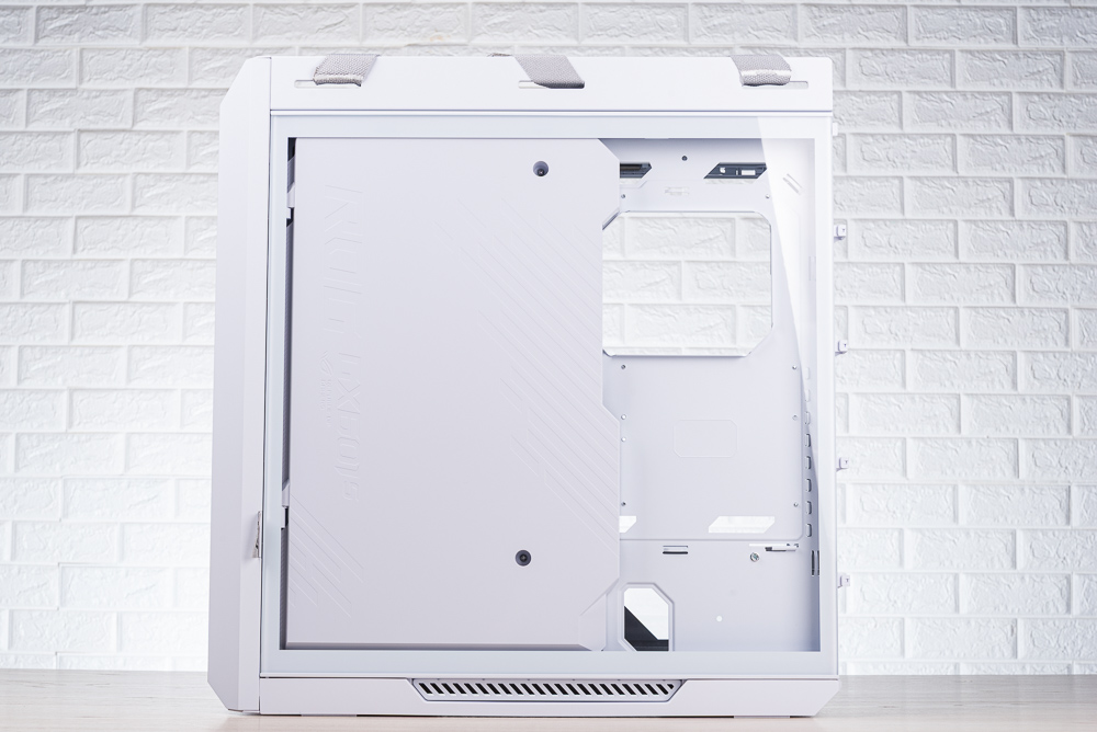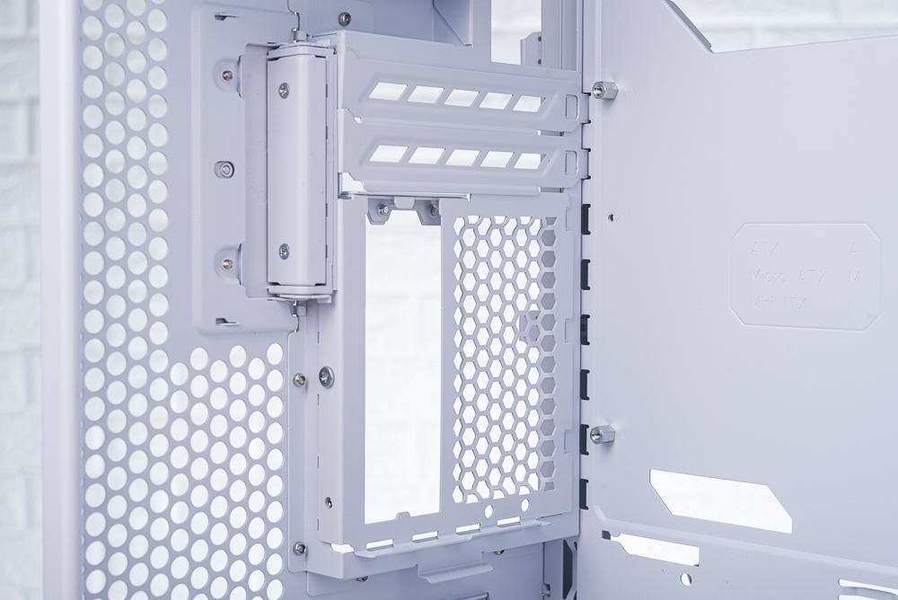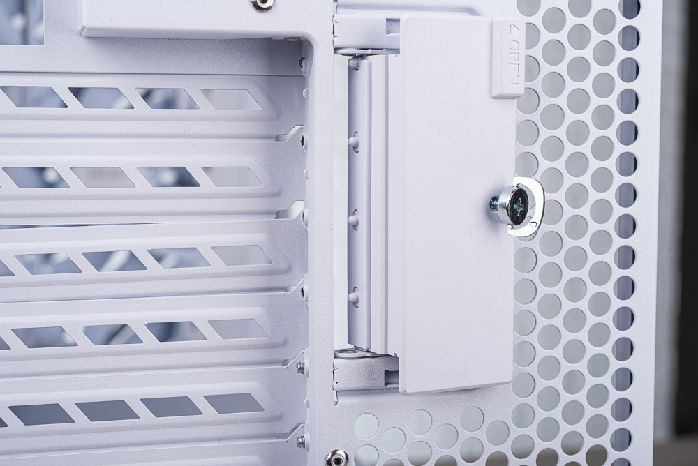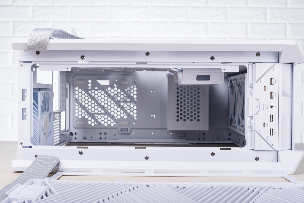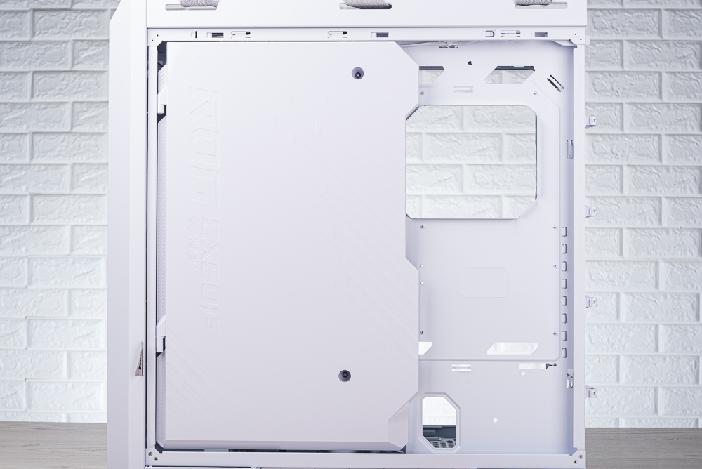 機殼左側、右側都採用玻璃側透,並在機殼後方有著按壓開關,可一鍵釋放玻璃側透,並具備防摔落的快拆設計。而機殼左側有著相當大的空間,具備 8 槽 PCIe 的空間,以及較高的電源分艙造型;機殼右側則有著白色理線蓋板。