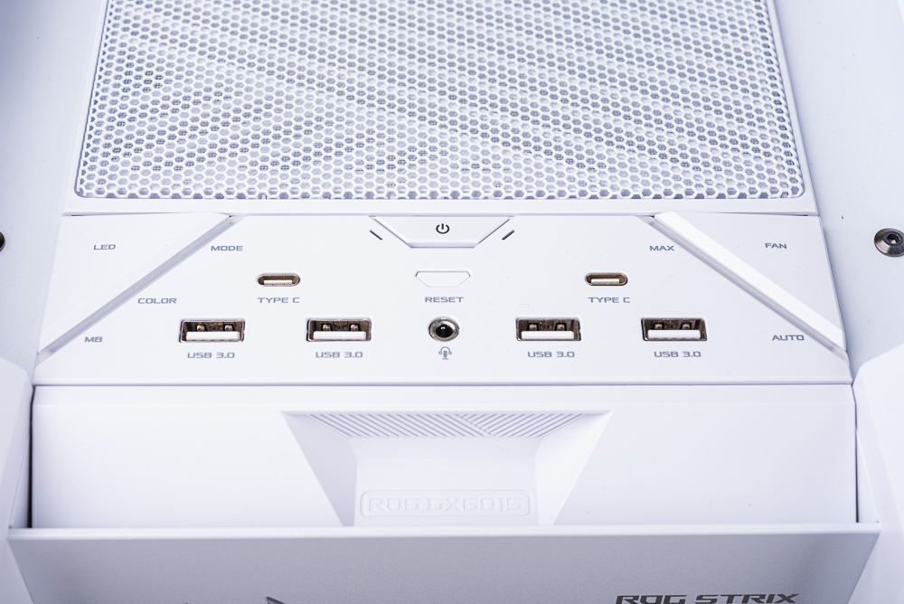 ROG Strix Helios II 將機殼 I/O 設置於機殼上方,提供電源開關、Rest 按鈕、FAN 按鈕與 LED 按鈕,以及 4 個 USB 3.2 Gen1、2 個 USB 3.2 Gen2x2 Type-C(可支援 60W 快充)與 3.5mm 耳機麥克風,這 I/O 數量可說是非常足夠。