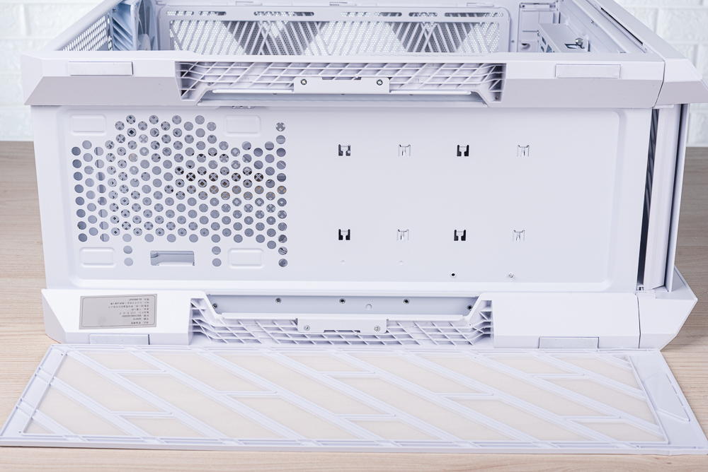 機殼底部則是延續機殼前門與上方的外框體造型,將外框視覺延伸成為機殼的腳座;而底部則有全尺寸防塵濾網,並且是從機殼前方抽取,因此玩家在清潔灰塵時也相當便利。
