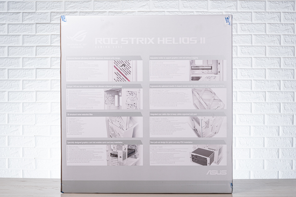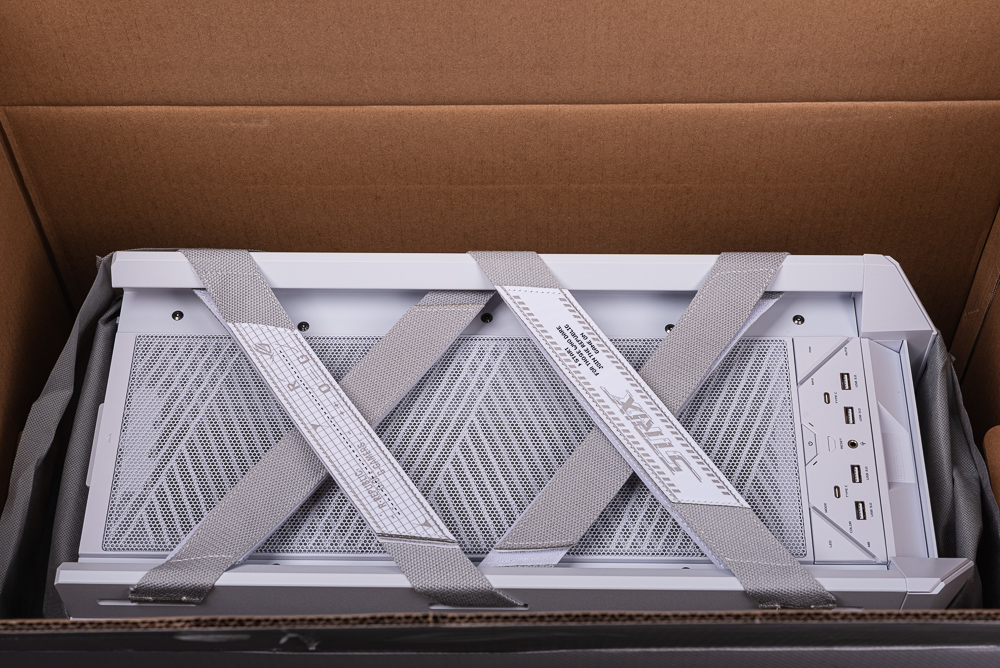 由於 ROG Strix Helios II 機殼高度來到 56.5cm,因此開箱時大家可利用機殼上方的編織提把將機殼硬舉出紙箱。