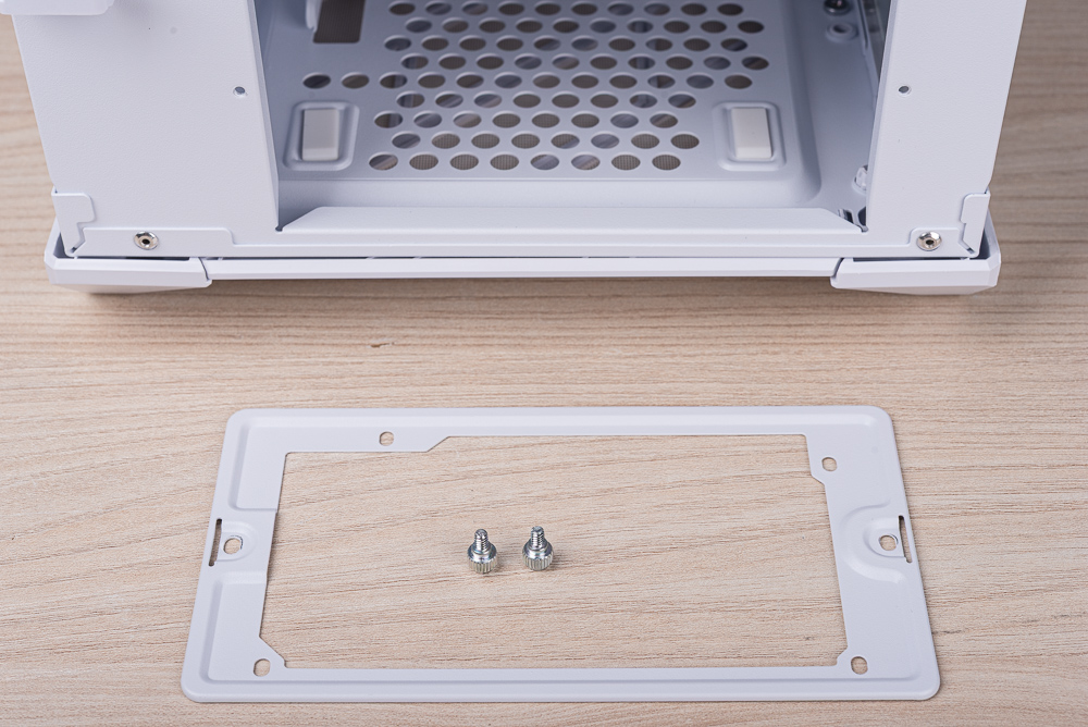 機殼右側採用玻璃側透,因此有著一塊造型理線蓋板,白色蓋板遠看相當好看也能遮蔽 2/3 的主要走線,但近看就是一整塊的塑膠蓋,並且需要 2 顆螺絲固定;這就考驗玩家理線的技巧了,若收線沒整理好這塊檔板會不好鎖上。