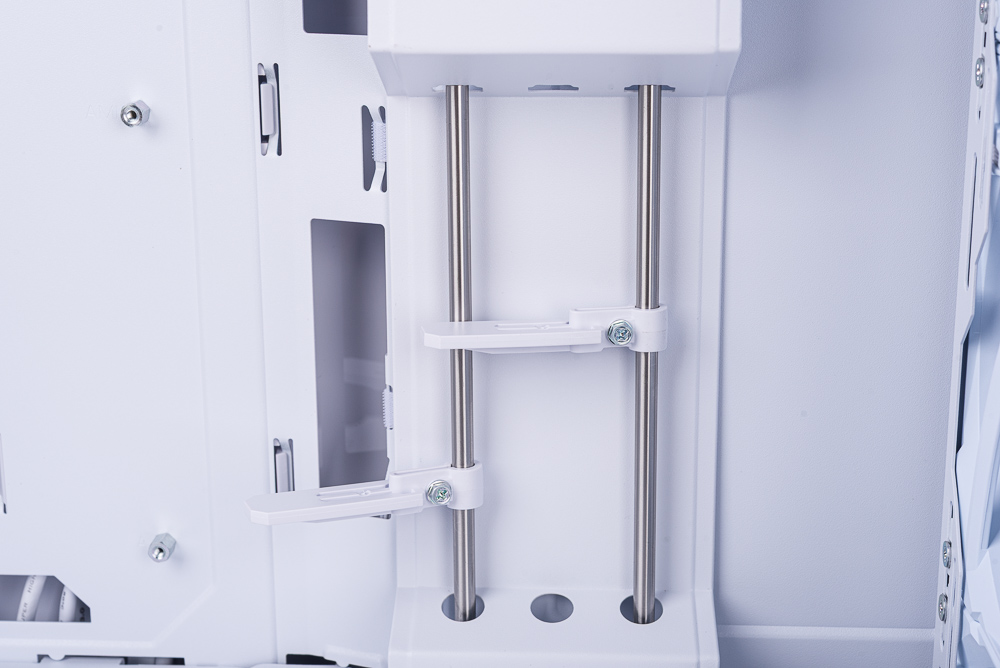 這代為了方便玩家安裝電供(不移除電源分艙檔板)的情況下,提供後抽式電源支架,讓玩家可將支架固定在電源後,再從機殼後方將電源線材與電源本體推入機殼當中。