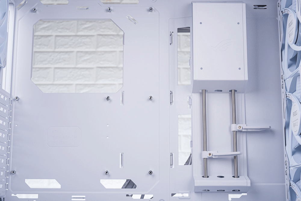 機殼左側有著相當大的空間可支援 E-ATX 與 ATX 等主機板,並在主板的上方、下方與右側都備有走線開孔。而主板右側則有著「多功能保護蓋」可依據主板尺寸來調整左右位置,並整合顯卡支撐架的功能。