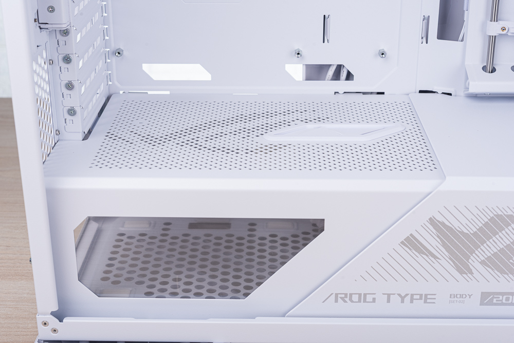結構上 ROG Strix Helios II 是左側單艙體形式,並透過兩個電源分艙區隔下方的空間,並在電源艙的位置備有透明櫥窗,可搭配展示 ROG 帶有 OLED 螢幕的電源供應器。