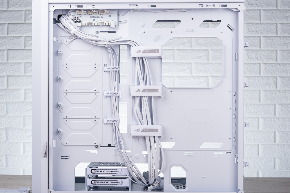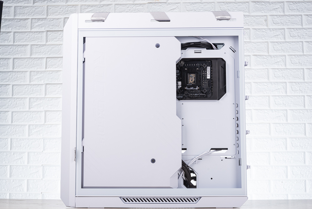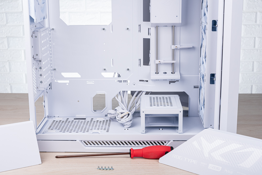 而機殼左側有著可調整的多功能保護蓋(顯卡支撐)、電源展示櫥窗,以及右側的理線蓋板與足夠的魔鬼氈方便玩家理線。但機殼整體結構並沒有大改的情況下,ROG Strix Helios II 的機身確實較為老派,因此 DIY 過程中會稍微繁瑣需要拆卸較多的螺絲才能順利組裝。