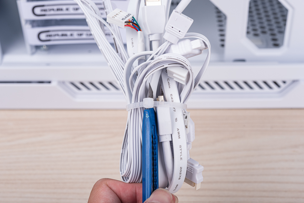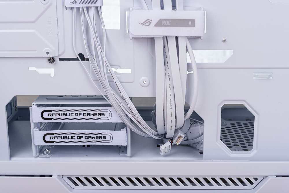 ROG Strix Helios II 出廠的預先理線確實紮實,但要注意的是機殼 I/O 連接線被束帶給整捆收納,玩家裝機時必須拆開束帶,這就要小心別傷到機殼的線材。