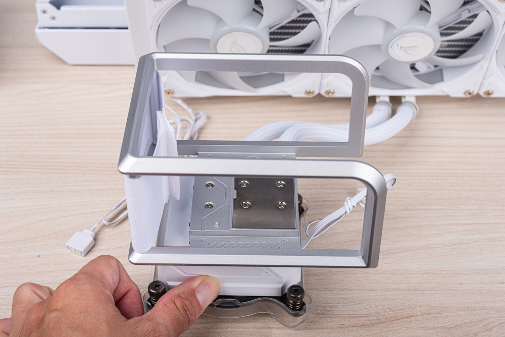 組裝時,可先將機殼上方的風扇框架取出,在機殼外先把水冷排固定在風扇框架上,接著再從機殼上方放入水冷散熱器,並微調水冷排的位置後鎖上固定。實際組裝,可見水冷管繞了相當極致的 S 曲線。