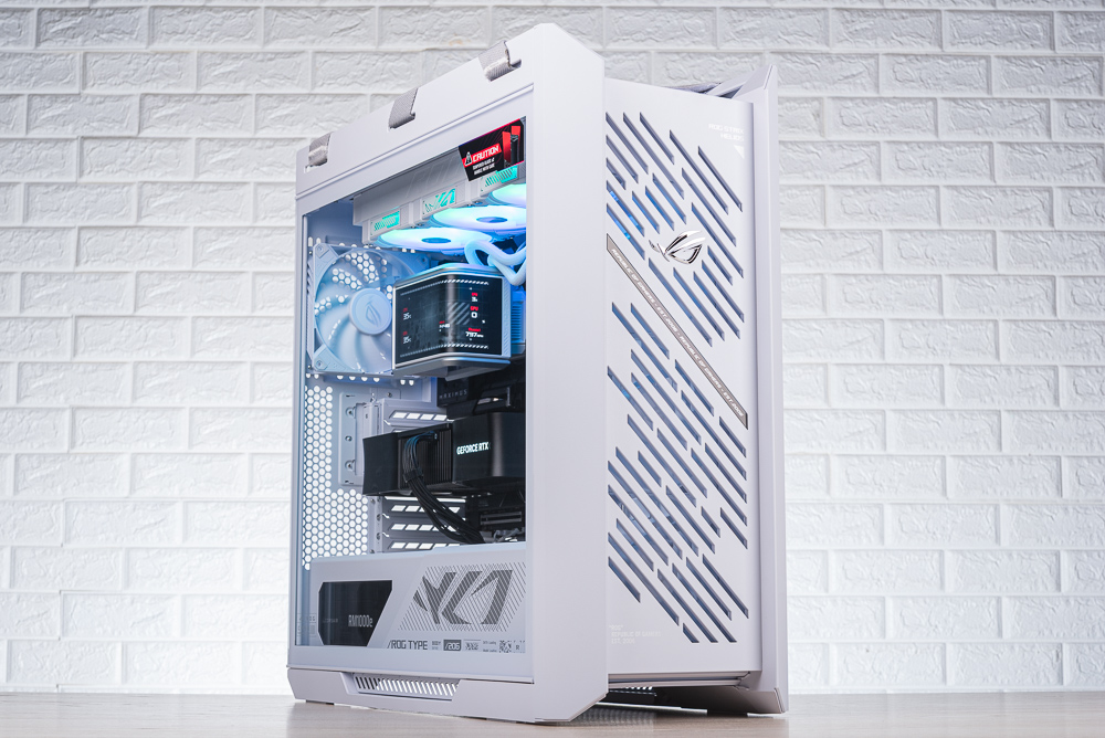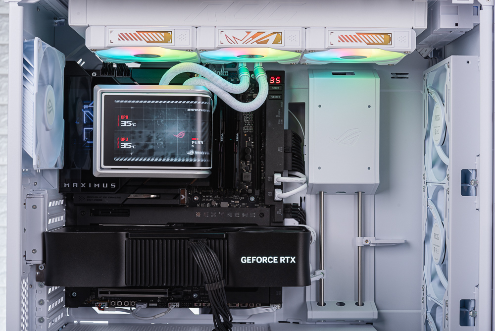 ROG Strix Helios II 組裝使用 ROG MAXIMUS Z890 EXTREME 主板、ROG Ryuo IV SLC 360 ARGB 水冷散熱器、RTX 4080 Super 顯示卡。實際組裝後的主機照片提供給大家參考。