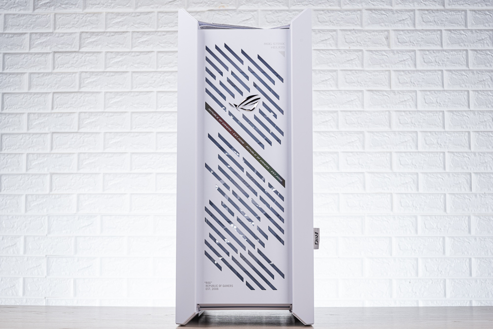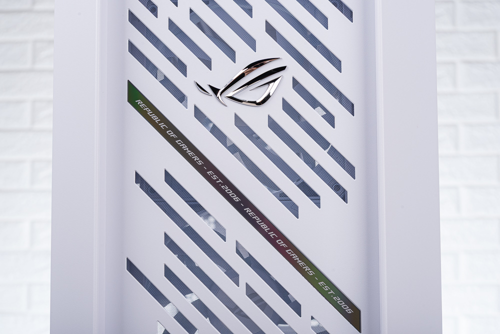 機殼前門,則改為鋁製門板藉由鑽石菱格網孔設計的斜切線條,讓機殼有著較好的前方進氣氣流。而門板中央的幻彩線條則有著 REPUBLIC OF GAMERS EST.2006 字樣。