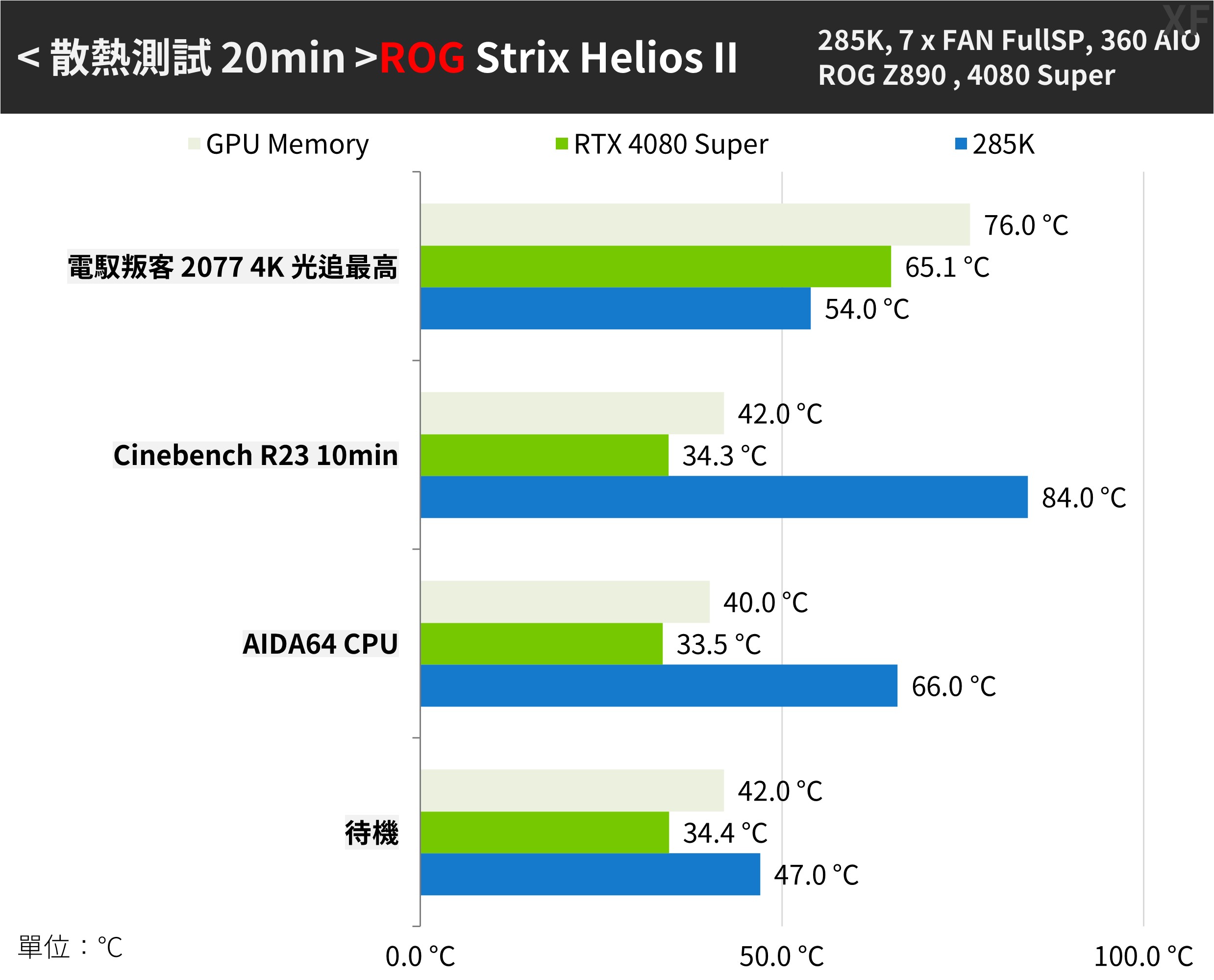 散熱測試,ROG Strix Helios II 在待機時 285K CPU 47°C、RTX 4080 Super GPU 34.4°C;在 AIDA64 CPU 壓力測試下,CPU 溫度來到 66°C;緊接著 Cinebench R23 壓力測試下 CPU 溫度來到 84°C。至於《電馭叛客 2077》4K 光追最高設定下 GPU 65.1°C、記憶體溫度 76°C。