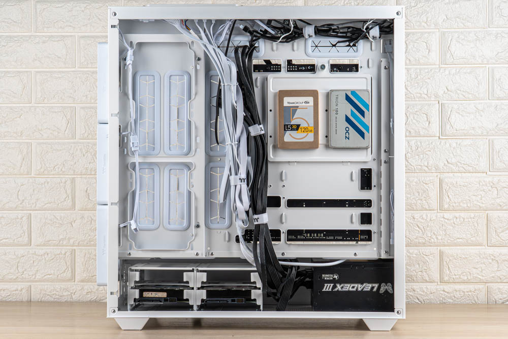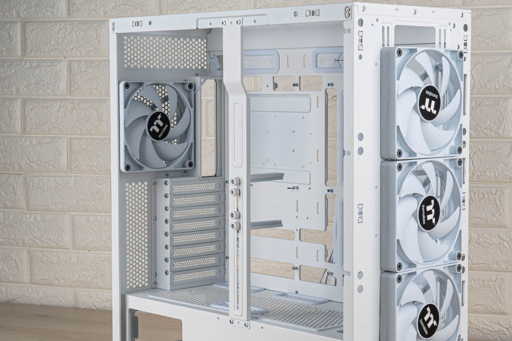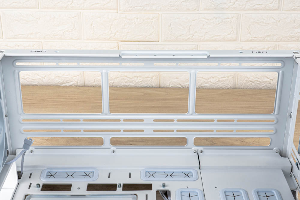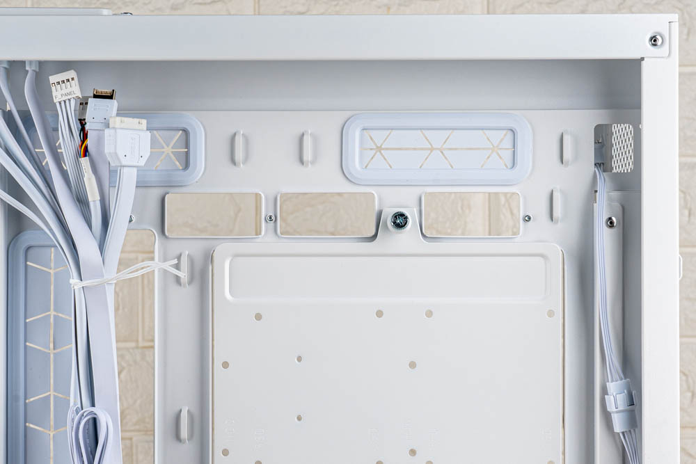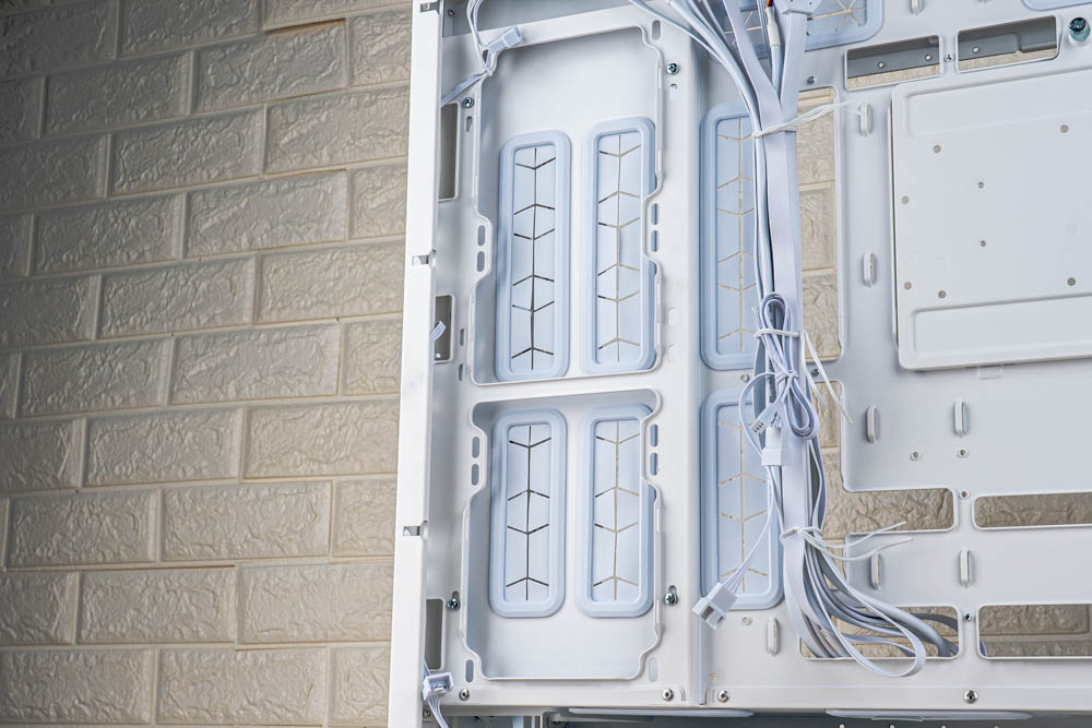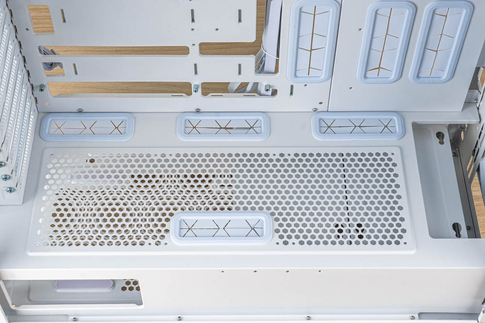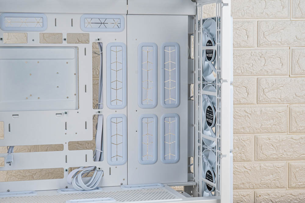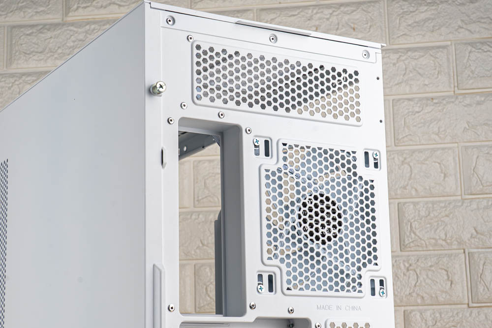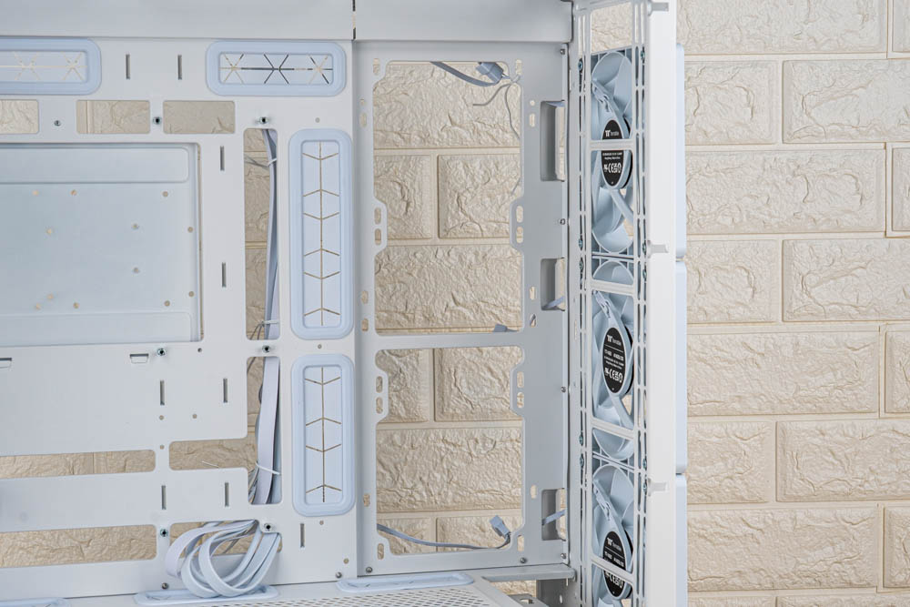 其中分艙上方,設有走線開孔,方便玩家連接主板針腳、顯卡供電走線;並提供 3 顆 120mm 風扇擴充位。