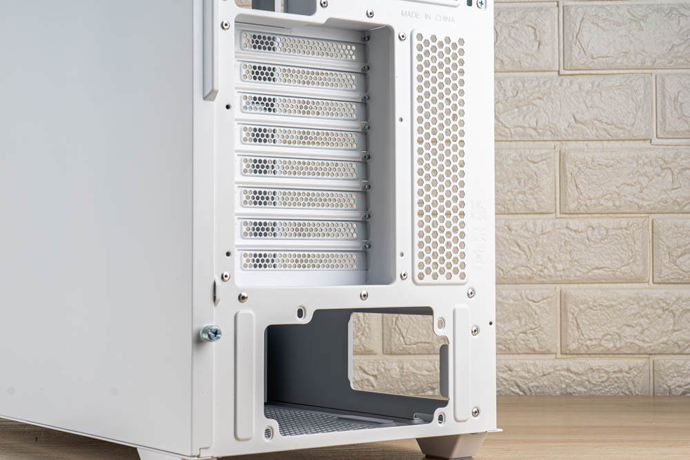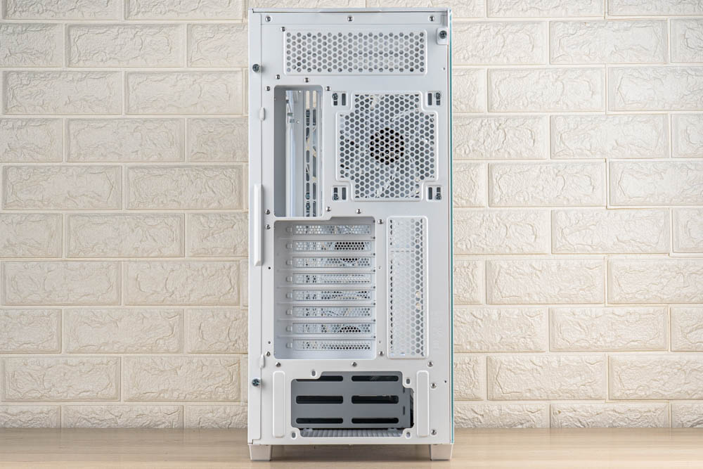 機殼後方,為標準開槽配置,其中主板I/O槽的上部空間,有預留給上置水冷使用,並預裝 1 顆 140mm CT140 後出風扇;而PCIe部分,提供 8 槽可擴充位,且為可拆卸檔板;電供部分則位於底部,採用傳統常見的四鎖孔螺絲來安裝固定。