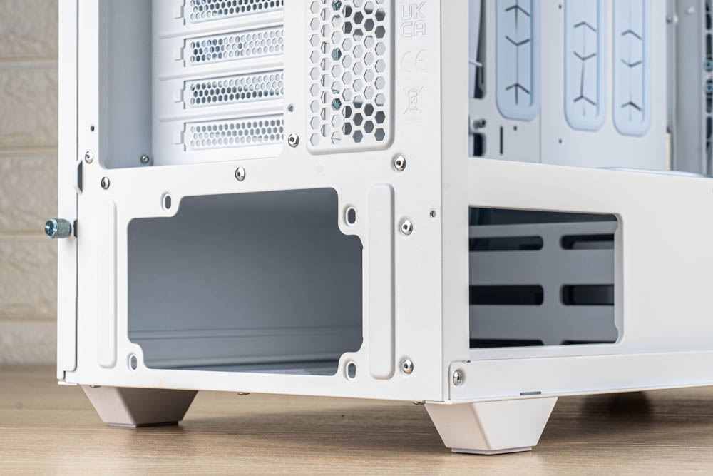 機殼左側為玻璃側透,採用通透明晰的強化玻璃,可清楚看見其內構空間;並且分艙電源位置,設有方形開孔,可進一步展示其電源外觀;而左側透的拆裝方式,則透過快拆式卡扣,搭配手擰螺絲來固定,方便玩家在 DIY 組裝時,對於機殼外觀件的拆裝體驗與穩固性。