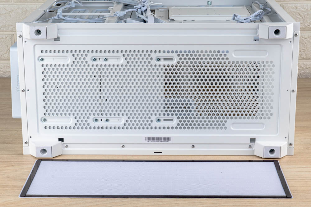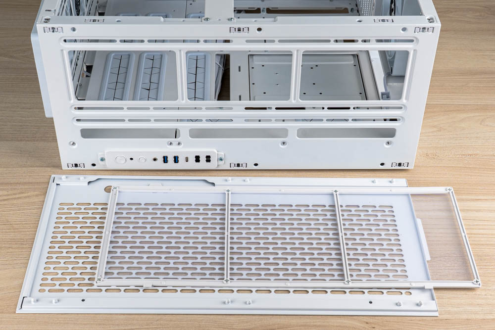 機殼底部,採用全網孔設計,搭配磁吸式防塵濾網,並設有兩個硬碟支架的螺絲開孔 ( 一個支架 / 4 顆螺絲固定 ),方便玩家調整硬碟支架的間距位置。