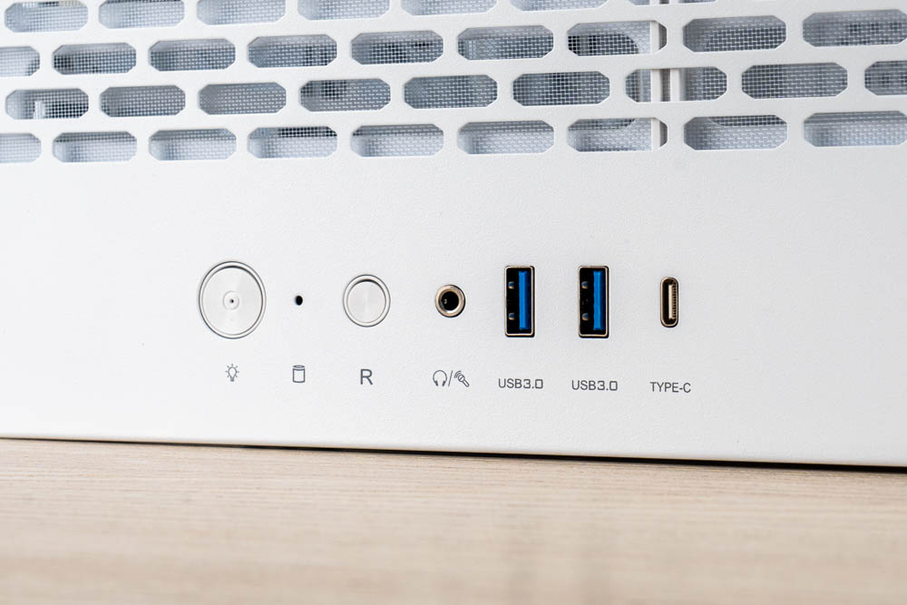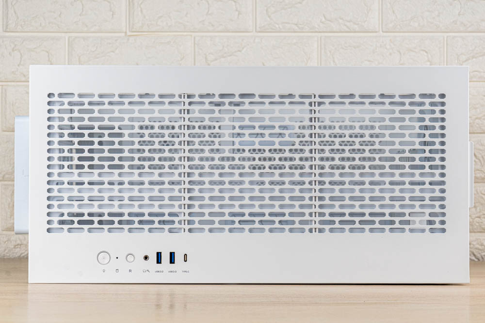 機殼前 I/O 配置,則設於機殼頂部的右前方,主要功能有開機、重啟、3.5mm 耳麥孔,以及兩個USB3.0 和 USB 3.2 Type-C等連接埠;並同樣設有大面積散熱網孔、磁吸防塵濾網,搭配快拆卡扣設計,方便上蓋固定與拆卸。