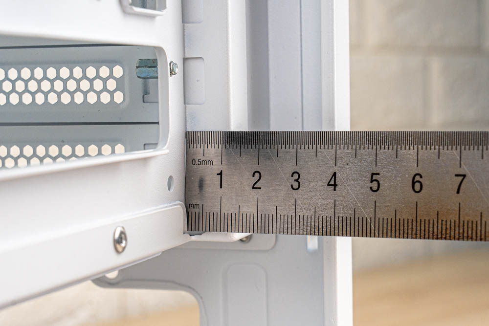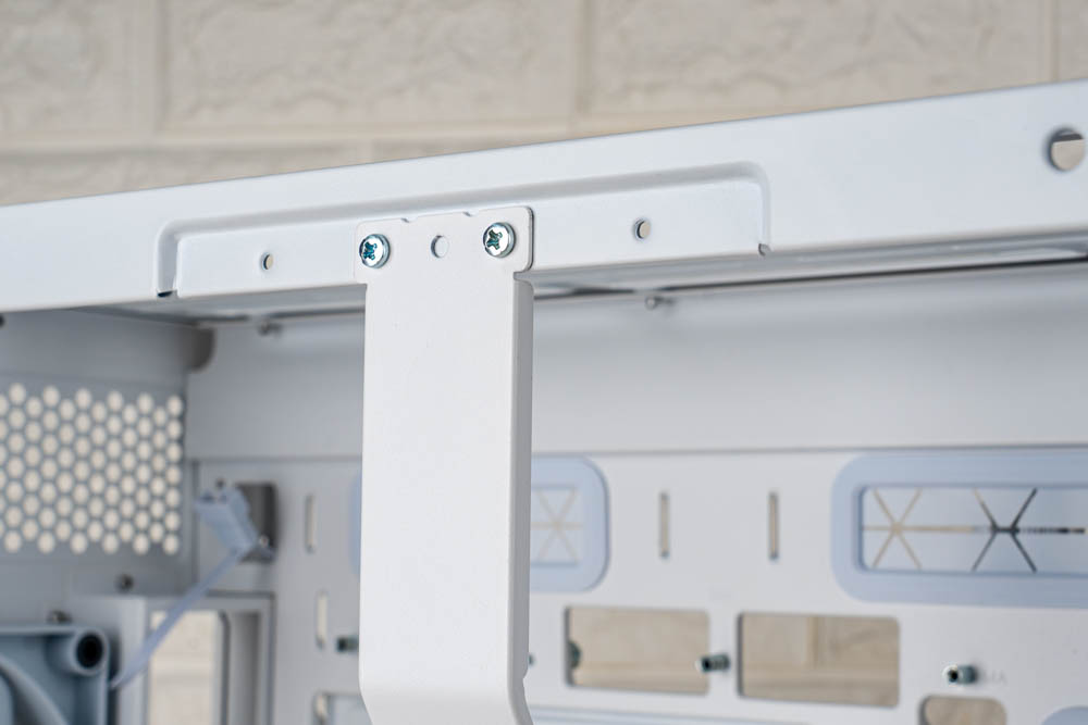 看完外觀,自然也要看內構設計,那肯定不會忽視 AX500自帶的顯卡支撐架,採用獨立式設計,方便快速拆卸,有著對應 8 槽 PCIe擴充位的可調高度,搭配上下螺絲的多段鎖孔固定,讓玩家在擴充硬體時,可依據顯卡或各類介面卡的長度距離做調整。