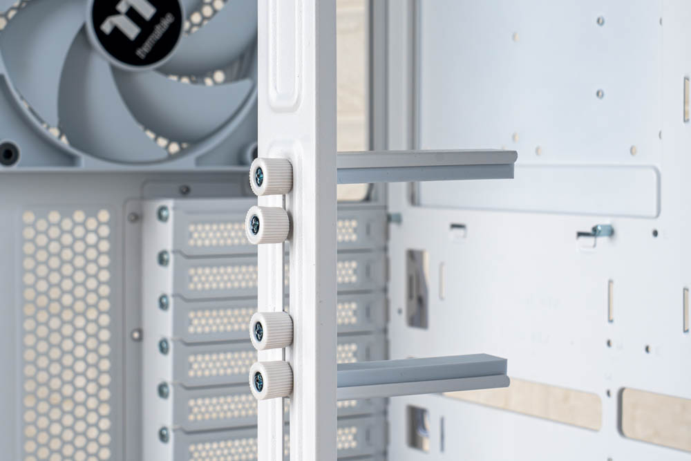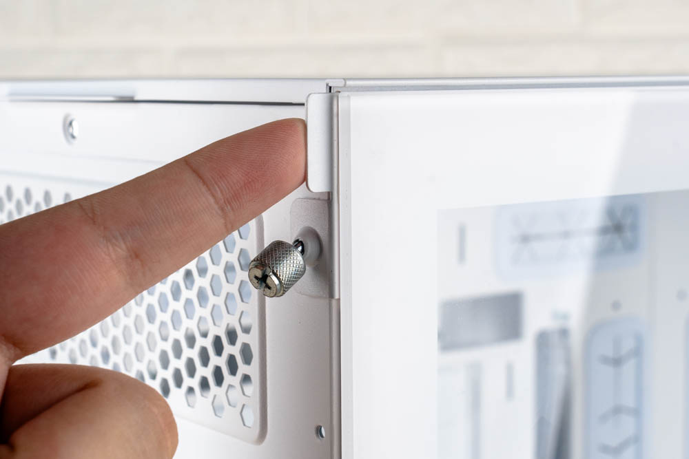 ↑ 機殼後方右上設有快拆施力點位與手擰螺絲,用於拆裝與固定左側玻璃。