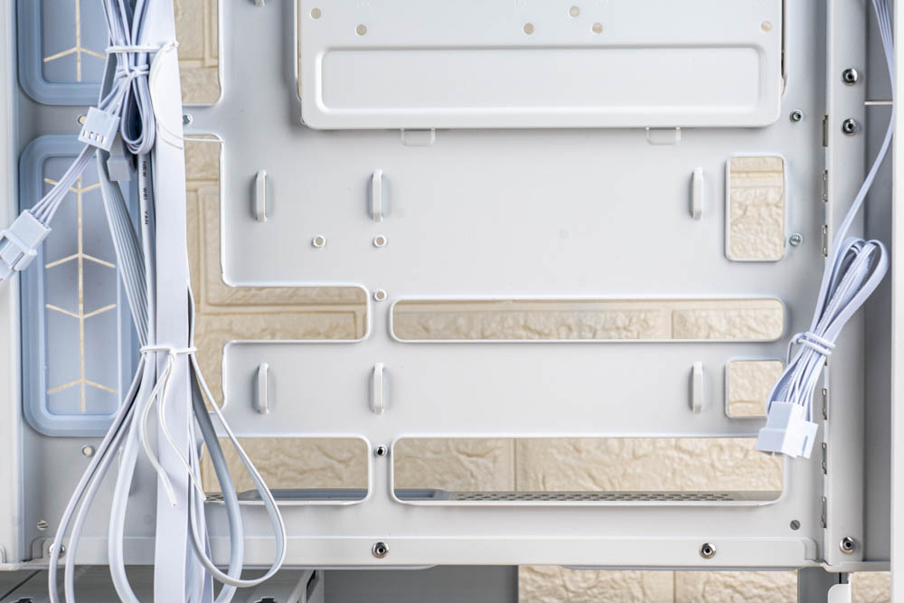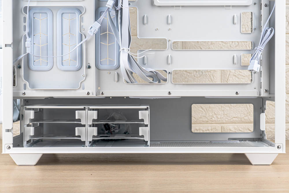機殼右側內構,有著加大的走線開孔,可兼容 ATX / m-ATX 背插主板;其走線位置,皆設有架橋與理線槽,且理線深度足有 36.5mm,方便整理線材,並配有 1 個硬碟板;而底部電源艙,則可容納200mm ATX 電源,搭配 2 個硬碟支架,提供玩家擴充與快速安裝。