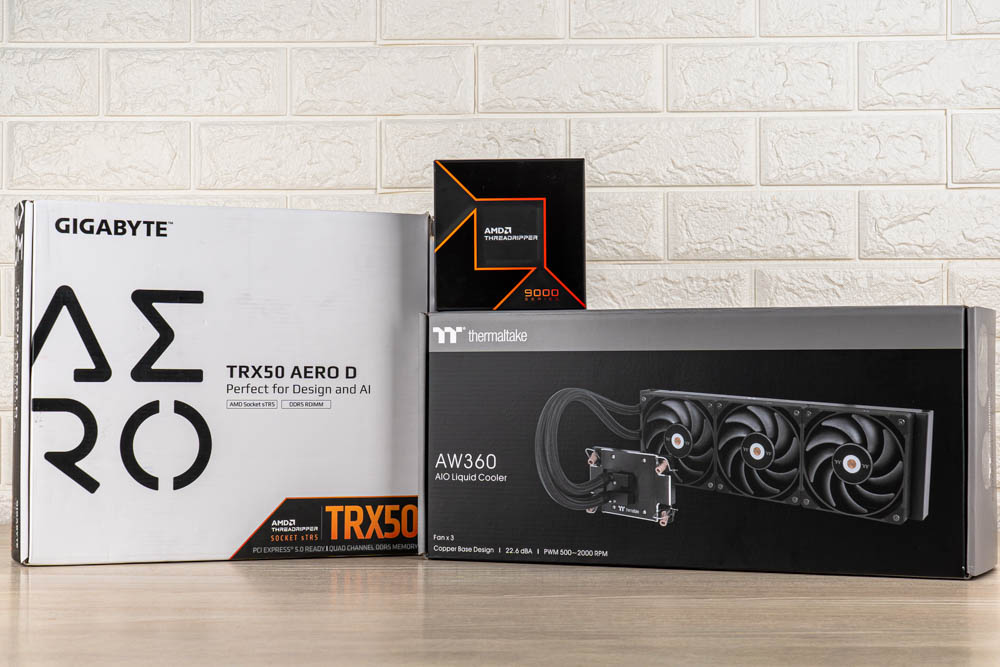 本次AX500裝機,將搭配 AMD 平台硬體作為組裝演示,主要為處理器 Ryzen Threadripper 9970X、主機板 GIGABYTE TRX50 AERO D、水冷散熱器Thermaltake AW360,其次為顯示卡 NVIDIA GeForce 4090 FE,以此搭建 DIY 專業工作站情境,並進行散熱測試。