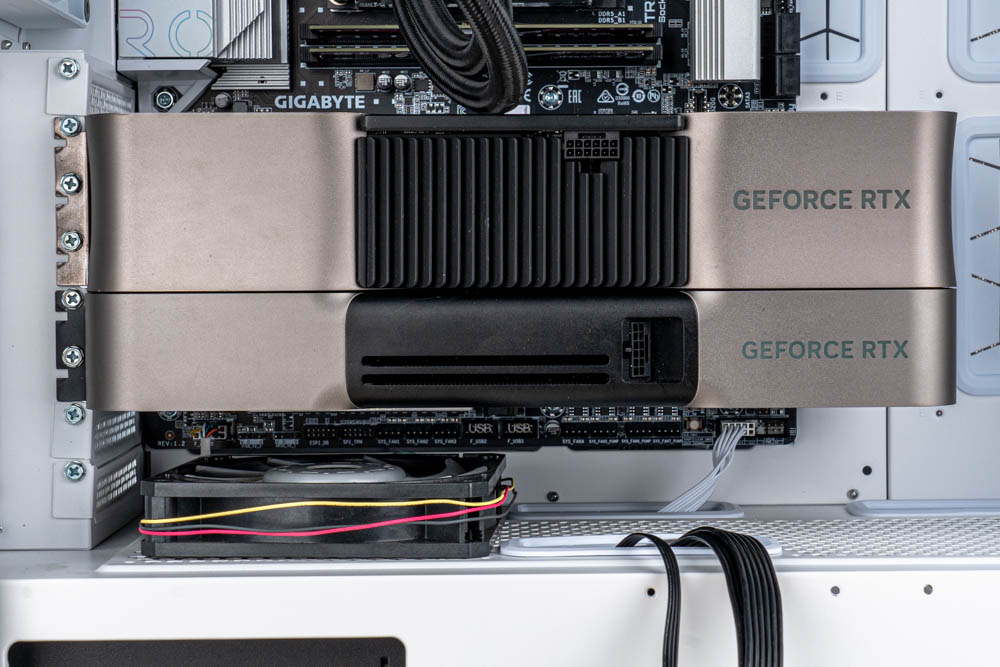 AX500 在搭配3-Slot厚度的顯卡NVIDIA GeForce 4090 FE 時,可見仍留有第二張4090 FE的安裝空間,但會與分艙上方的風扇擴充位,相互共用空間;因此想組建雙顯卡運算的玩家,若要保留風扇擴充位,可搭配較小厚度的顯卡為宜。