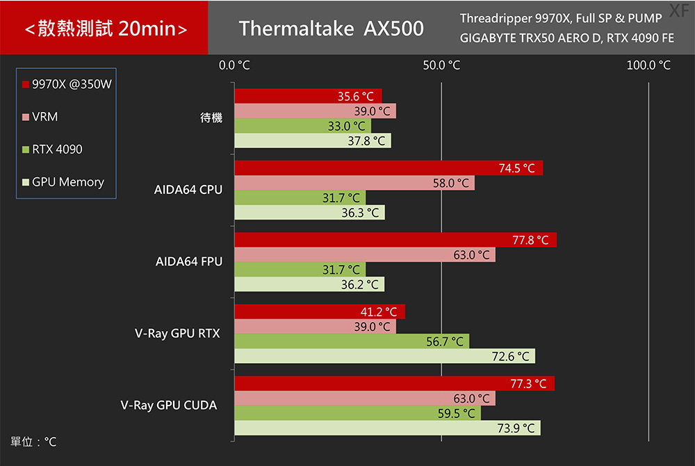 散熱測試環節,主要透過 AIDA64 CPU / FPU壓力測試,模擬日常與高強度應用下的CPU溫度;以及 V-Ray GPU RTX / CUDA 渲染測試,針對單顯卡 GPU 負載,與CPU、GPU同時負載溫度,來觀察 AX500 溫度表現如何;並透過BIOS將風扇設置全速,CPU則保持預設 350W TDP。