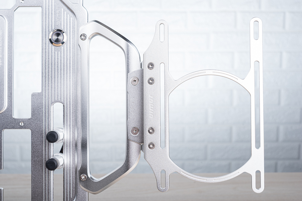 靈活可調的風扇支架,預裝在 Shift 的左邊、右邊與上方的 T 形把手處。風扇支架可支援最多 3 顆 120mm 風扇與 360mm 水冷排。風扇支架的角度調整,可通過後方的扳手固定角度,鬆開後即可隨意調整 90-180° 之間的支架調整範圍。