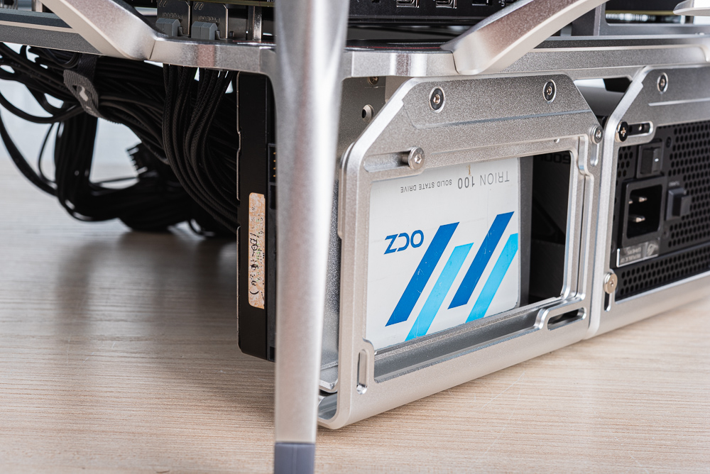 老實說 InWin Shift 感覺不像是裸測平台,而是挑戰開放式機殼與鋁合金材料的藝術感。獨特沙模鑄造的鋁合金腳座,整片鋁合金 CNC 精密切削及細緻噴砂處理打造的主板安裝空間,支援著 E-ATX 大板子與現在流行的背插式主板,並提供 7 槽 PCIe 固定支架與顯卡垂直安裝的功能,亦提供 2 個顯卡支撐架對應不同顯卡的安裝需求。