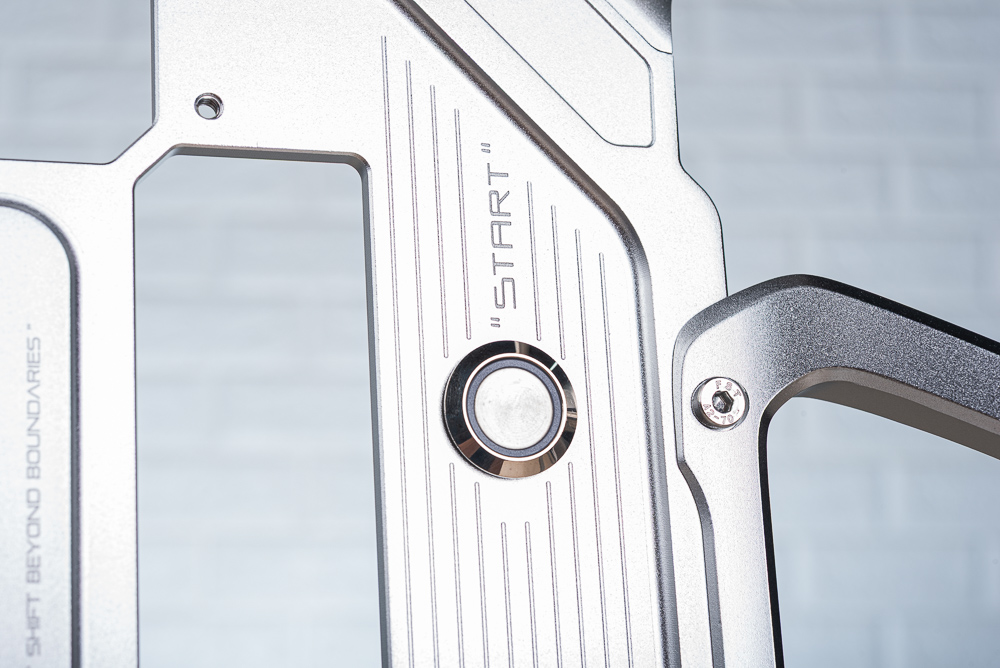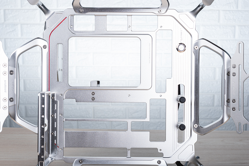 InWin Shift 採用高質感的鋁合金打造,中間主要的主板安裝區域,採用鋁合金精準加工出螺絲開孔、背插支援開孔,以及在右上角留有一個開機按鈕、SHIFT BEYOND BOUNDARIES 等字樣。而在四個角落則有獨特沙模鑄造而成的腳座,搭配四邊 T 形把手與可拆的風扇支架。