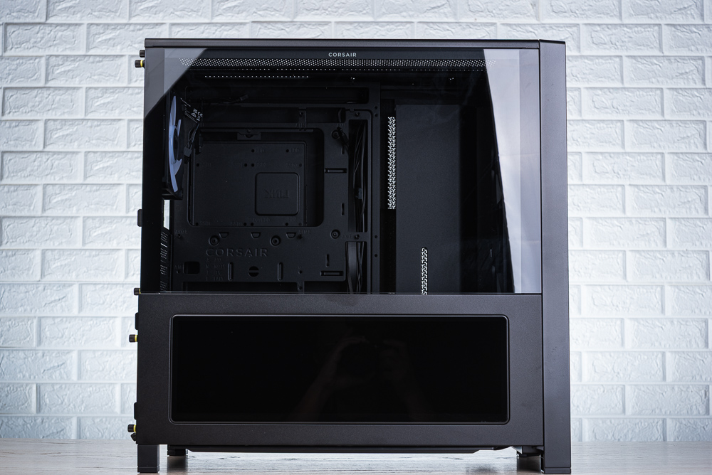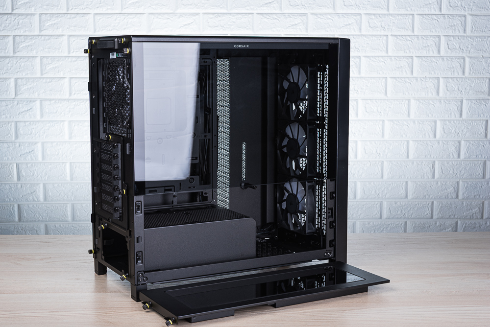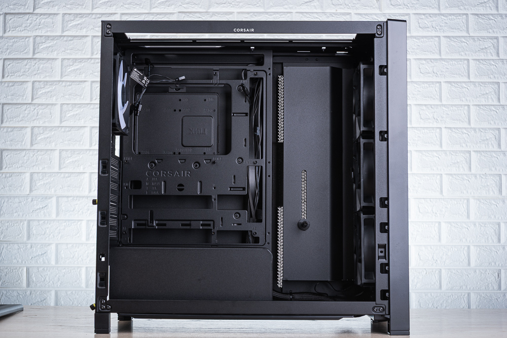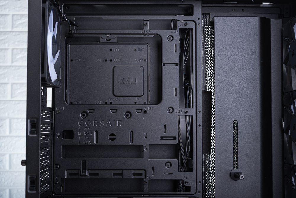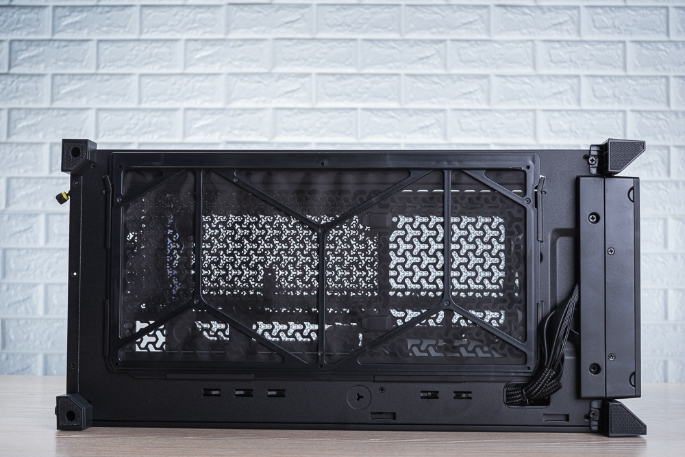 機殼左側的主要安裝空間,支援著最大 E-ATX(最寬 277mm)主機板,以及背插 ATX、M-ATX 等主機板。在主板的上方、右側、下方都留有相當大的走線開孔;且機殼右側的造型檔板也可移除,更換成風扇框架,讓玩家在 DIY 組裝時有著相當大的彈性。
