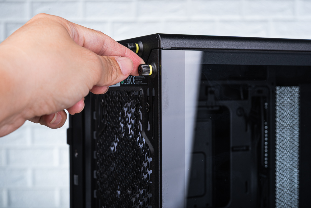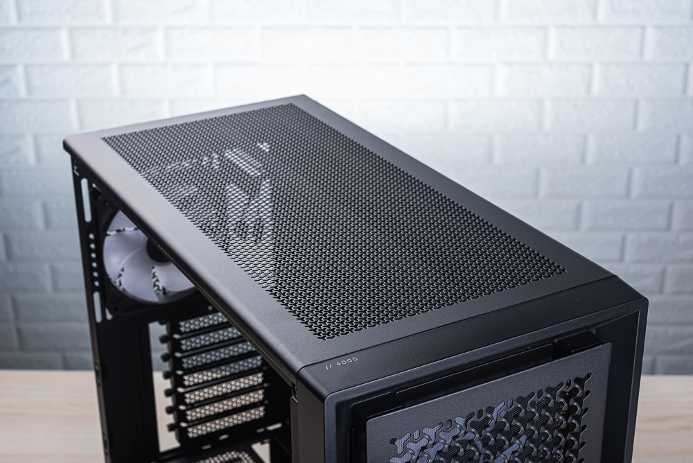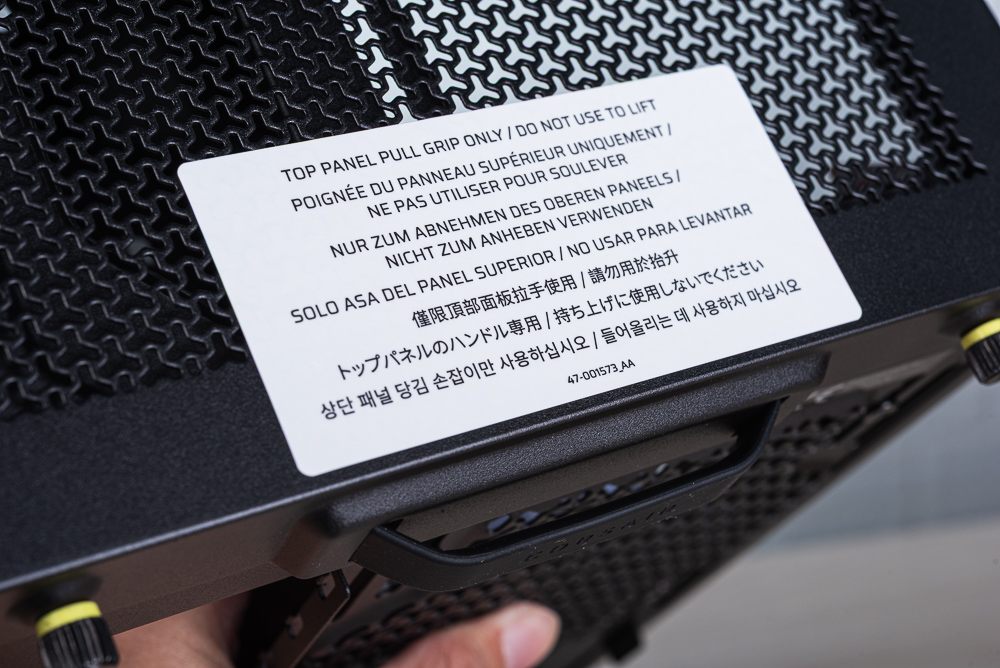 機殼上方同樣採用 Y 型網孔頂蓋,並修飾兩側的圓角線條迎合前門的造型;上方側板在後方有兩顆手擰螺絲固定,鬆開後向後一拉即可移除上方側板。