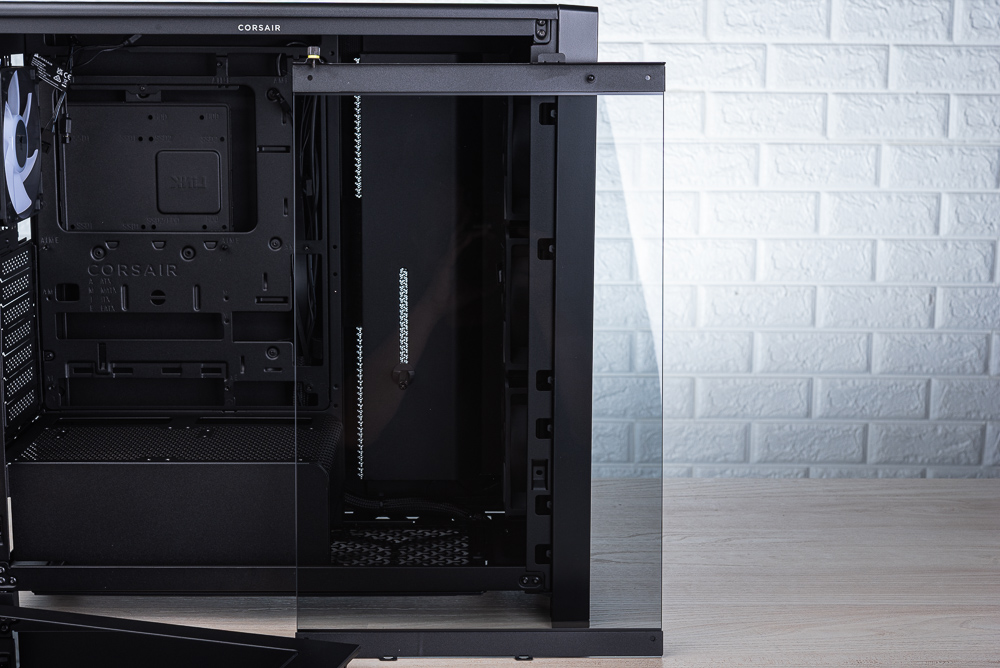 機殼左側玻璃側透、左側 LCD 側板,都採用快拆卡扣固定,於機殼後方有手擰螺絲固定,只要鬆開後即可輕鬆取下玻璃側透與側板。