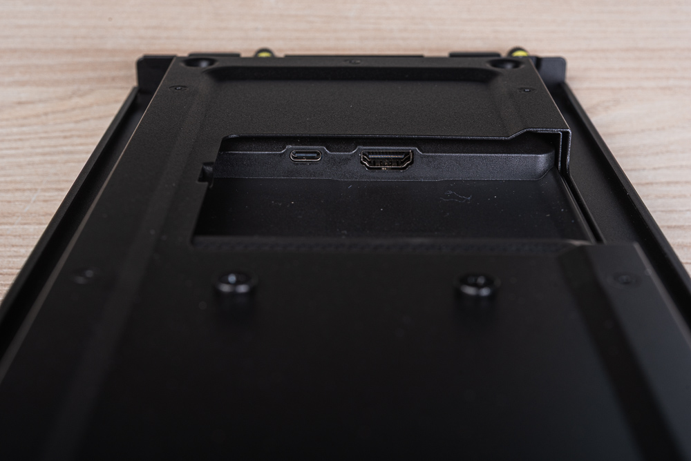 左側 LCD 側板背面,則有著完整固定 XENEON EDGE 14.5 吋 LCD 觸控螢幕,可提供 2560 x 720 解析度、60Hz 更新率,並使用 HDMI 或 USB Type-C DP-Alt Mode 連接螢幕訊號與供電。