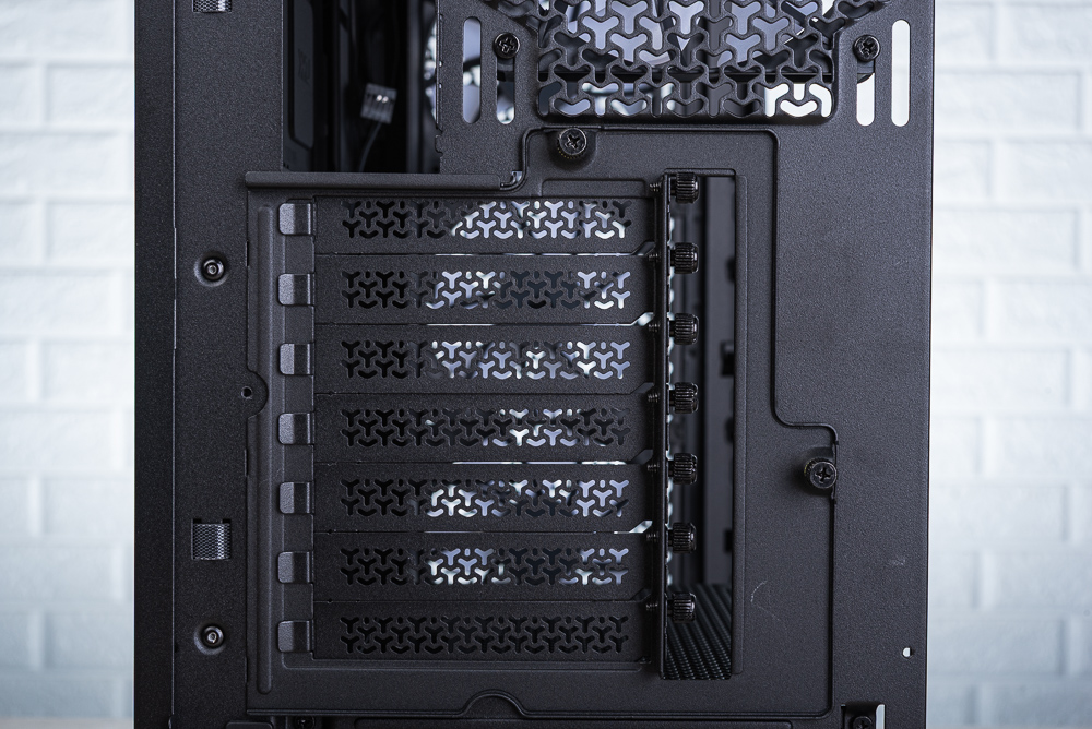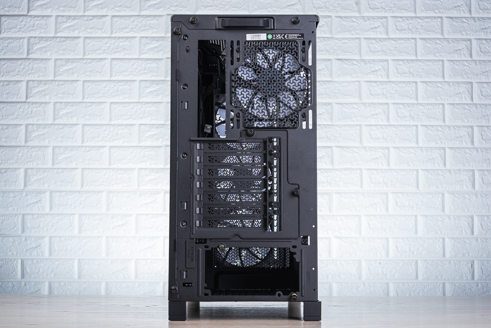 機殼後方,已經預裝 1 顆 RS120 ARGB 後方出風扇;並在下方有 7 個 PCIe 插槽安裝空間,並支援垂直安裝;底部則是電源安裝位置,並已經預鎖 2 顆手擰螺絲。