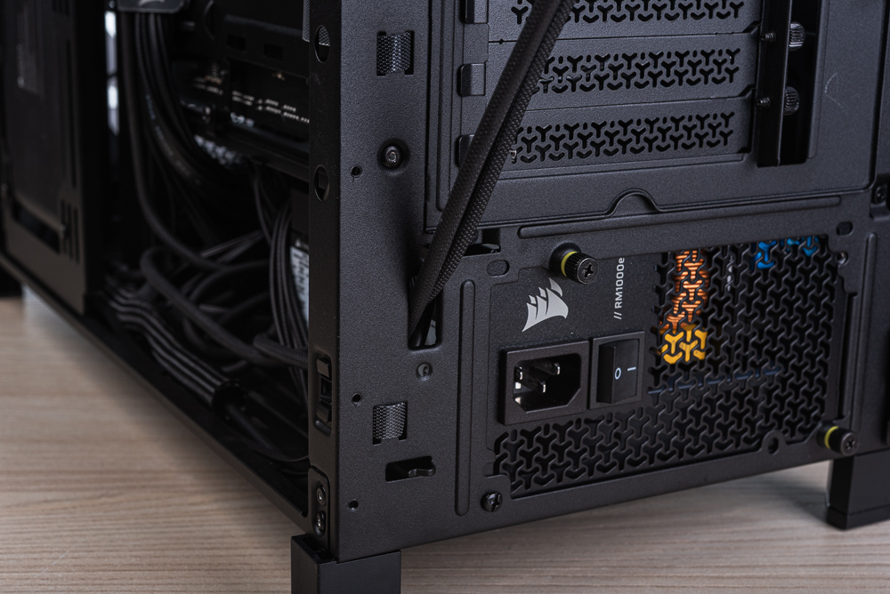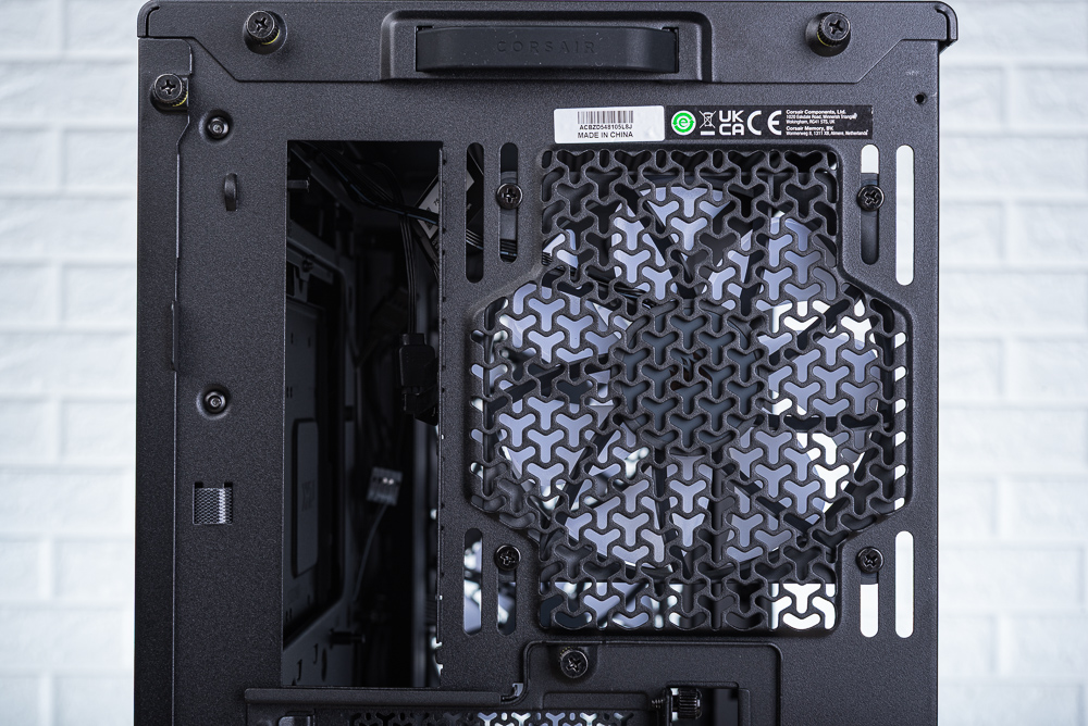 ↑ 機殼後方,上側版的橡膠把手;後風扇出風孔與主板後 I/O。