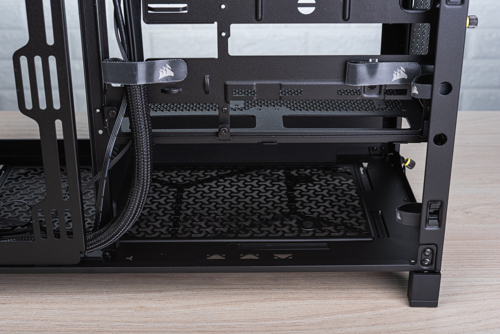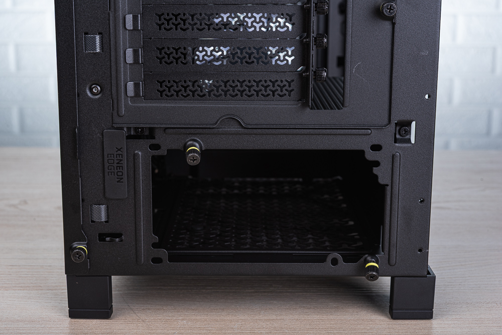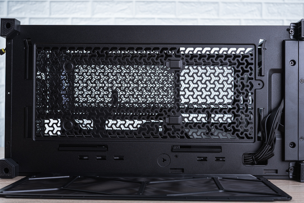 機殼底部有著較大的變化,底部全改為加大 Y 型散熱開孔,並有著滿板的防塵濾網;而前 I/O 線纜則從底部走回機殼當中。