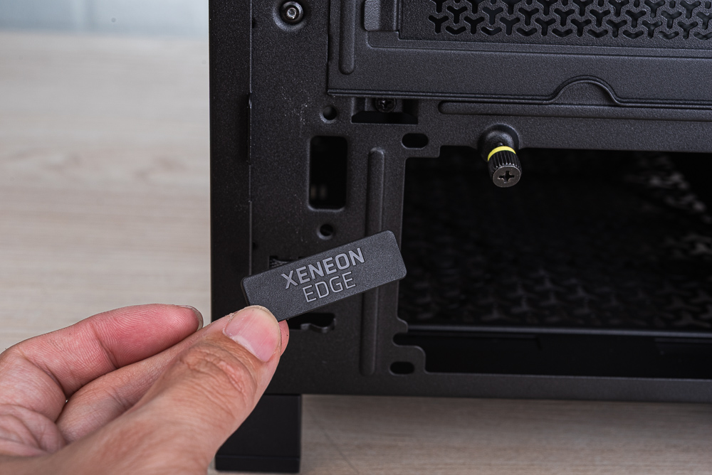 電源後方留有一個「XENEON EDGE」的塑膠片,拆掉後這個位置有著走線開孔,方便玩家將 LCD 螢幕的訊號線連接至後方的顯卡或主板內顯。
