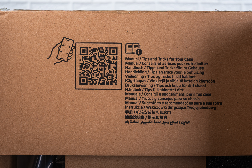 開箱時在紙箱的上蓋印有 QR-Code 掃描後可取得機殼的電子說明書;出廠時,機殼在左側、右側防塵網上都貼有固定貼紙避免運送時脫落;機殼上蓋後方則貼有警語,後方的橡膠把手僅用於向後拉開上蓋而非抬起機殼。
