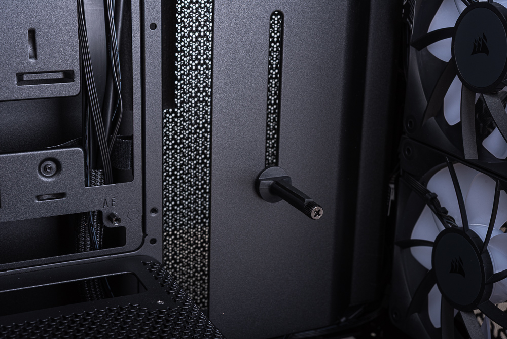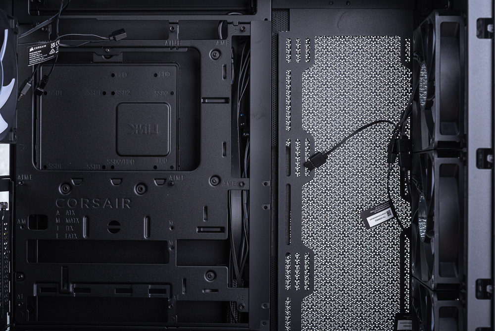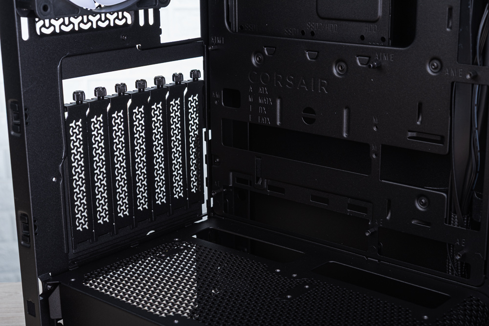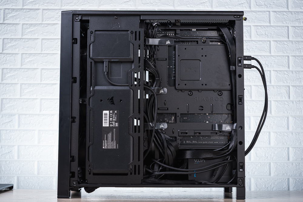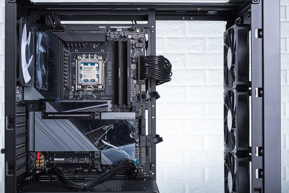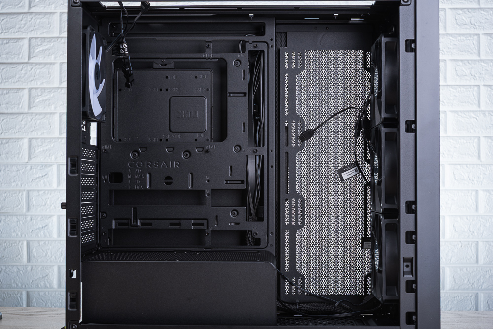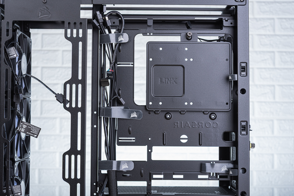 機殼右側,有著相當深的整線空間,並在走線主要路徑都備有魔鬼氈固定,以及提供各種架橋方便玩家固定線材。而主板托架則有著相當好走線的開孔,組裝上完全不用擔心理線的問題。