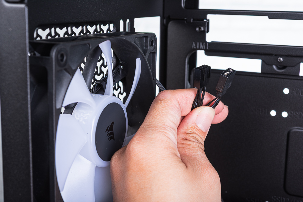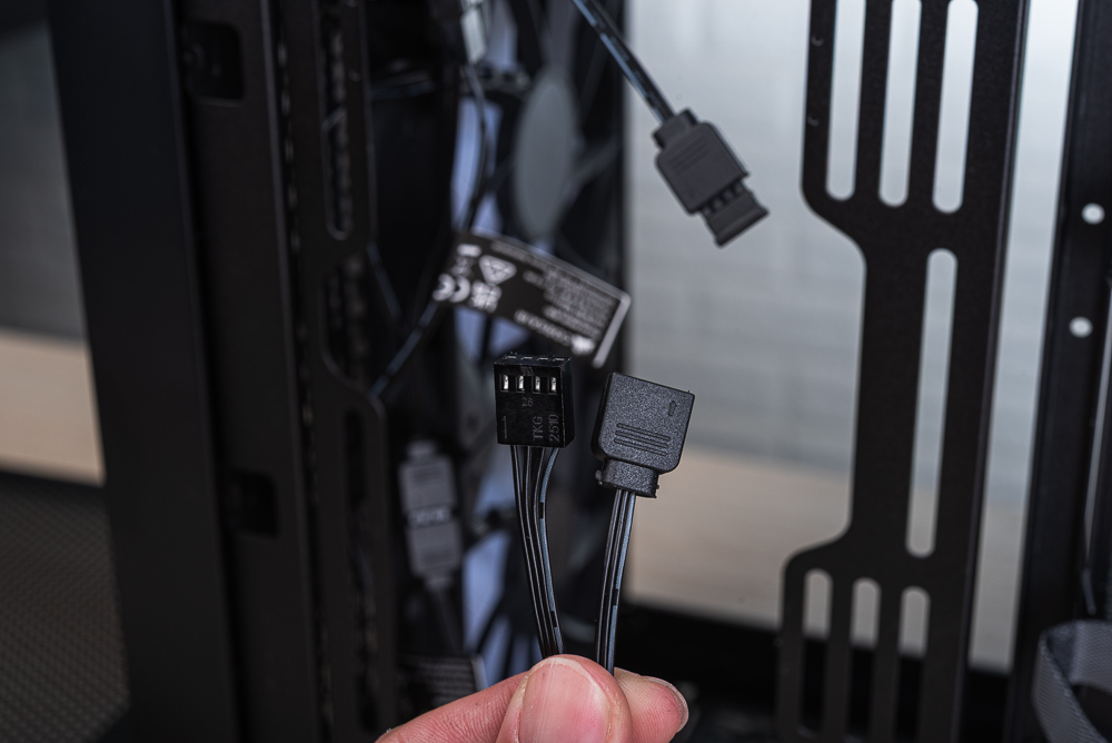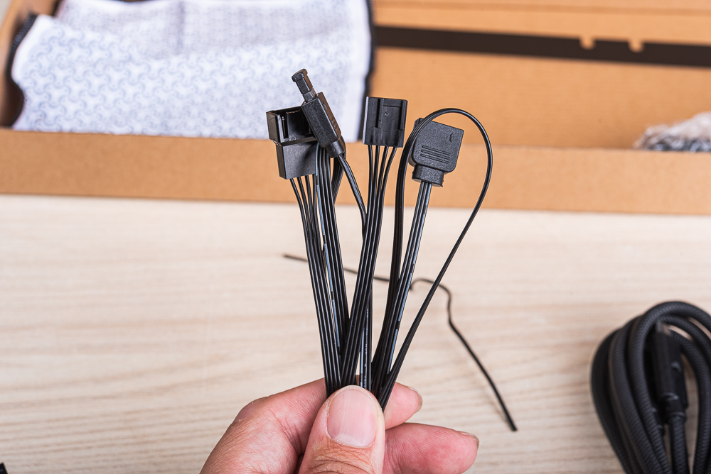 至於前門風扇則是三串一需連接 PWM 4pin與 ARGB 3pin;只不過機殼後方風扇一樣要再連接 PWM 4pin與 ARGB 3pin,配件中有提供延長線。