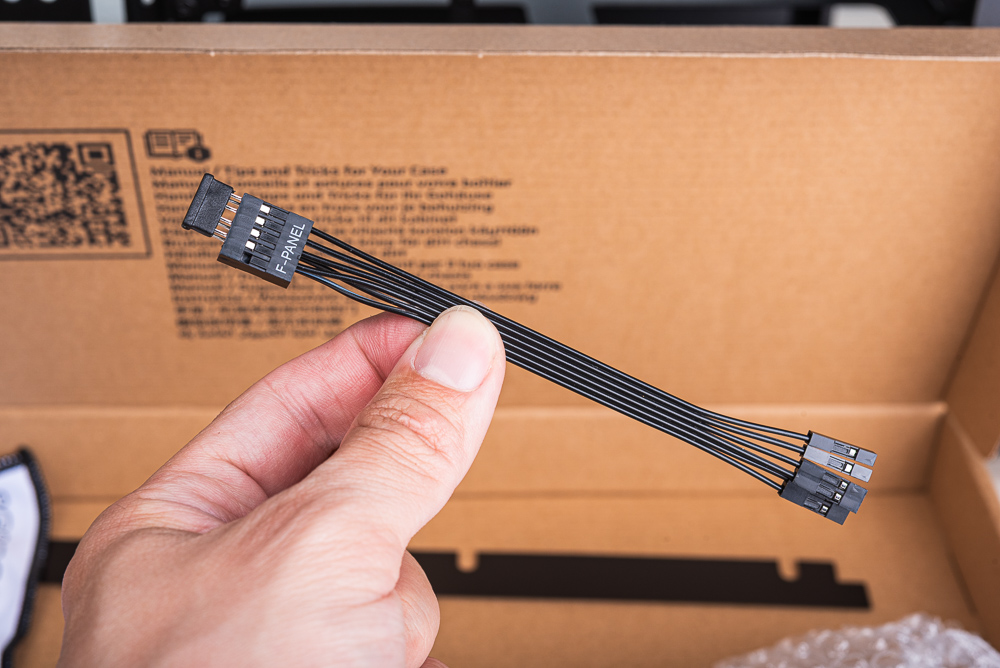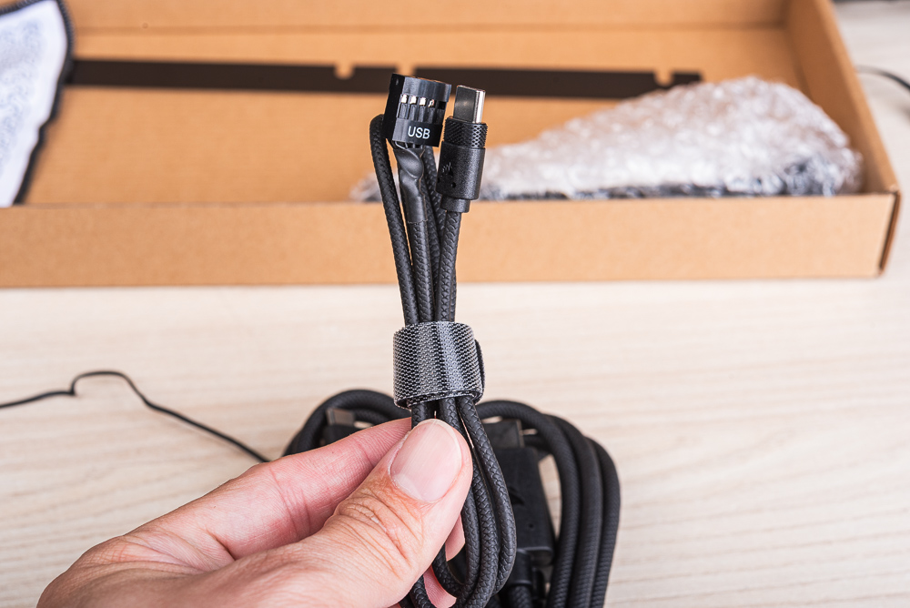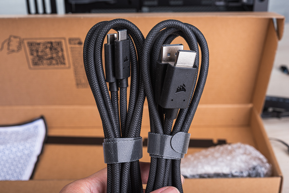 配件中除了機殼的安裝螺絲、束帶外,以及上述提到的側面風扇架、磁吸檔板、垂直顯卡支撐架、前面板針腳延長線、後方風扇延長線等配件,還有 3 條 XENEON EDGE 螢幕使用的連接線,包含 1.8m HDMI 轉 DisplayPort 訊號線、1.8m USB Type-C DP-Alt Mode 訊號線、0.7m 內接 USB 9-Pin 轉 USB Type-C 連接線。