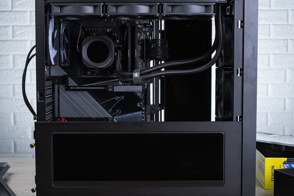 組裝 FRAME 4000D LCD RS ARGB 並不會太困難,但尺寸上屬於中塔 ATX 機殼,因此在安裝上方 360mm 水冷時,會需要稍微喬個角度才能順利將水冷排塞入機殼當中,此外預裝的風扇也需要自行理線,但只要透過魔鬼氈、架橋與束帶即可輕鬆搞定。