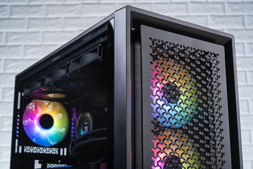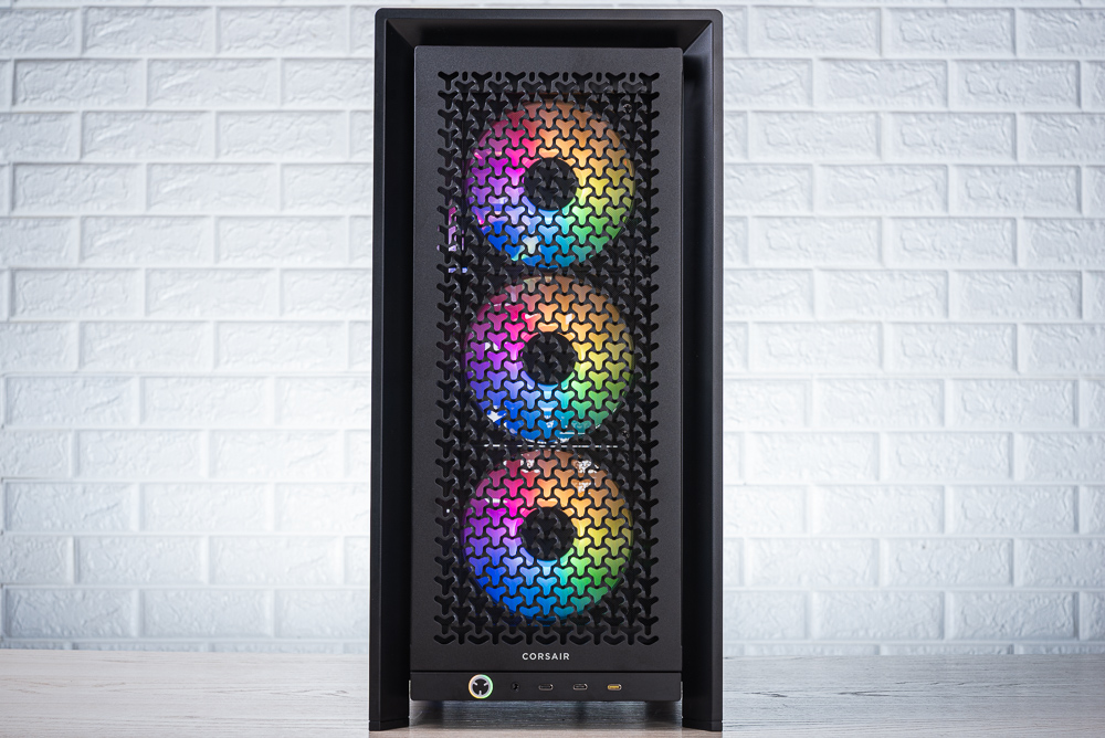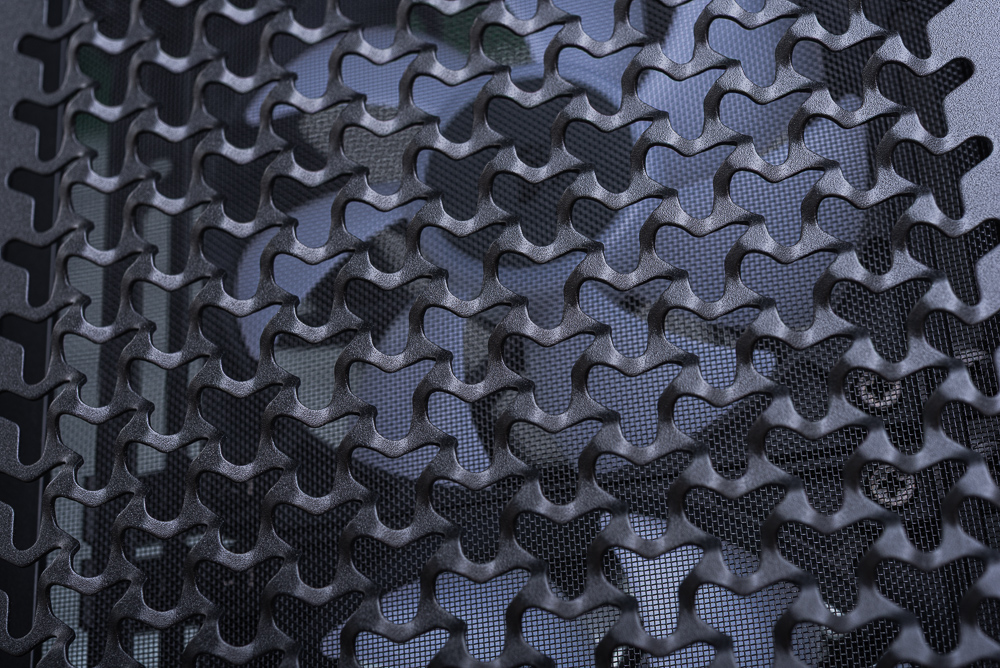 ↑ 特寫立體 Y 型網孔前門與後方的 ARGB 風扇。