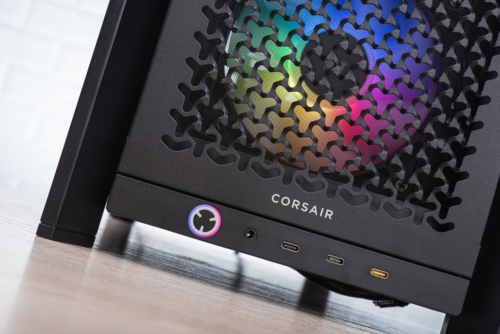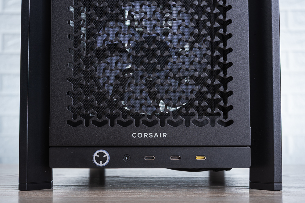 機殼前門維持著海盜 D 系列的造型,以及可拆卸的獨特立體 Y 形網孔門板,能帶來更好的進氣氣流,而前門下方則有著 RGB 電源按鈕、3.5mm 耳機/麥克風、2 個 USB 3.2 Gen1 Type-C 與 USB 3.2 Gen2 Type-C(黃色)。