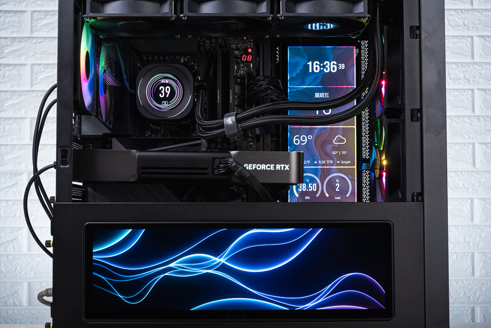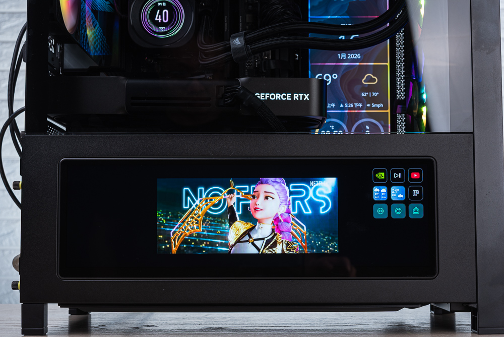 機殼左側,這時將兩顆 XENEON EDGE 螢幕設定為顯示小工具。亦可將螢幕當作圖片展示,讓機殼有著數位相框的功能。